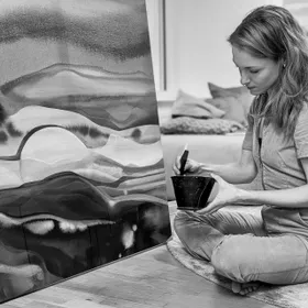 Her work is characterized by a search for unique effects, combining flowing color gradients, sharp contrasts, and color gradations—often accompanied by a vibrant dose of chance that breathes life into her pieces. As a physician, she has always had a predilection for the extraordinary and for people, and has therefore worked as a doctor in Germany's largest prison and in acute psychiatric care. Her works are a reference to the unconscious processing of every human being. She dilutes acrylic paints with water and applies them in numerous transparent layers. This technique creates overlays and depths of color that take the viewer on a visual journey between reality and abstraction. Her style is an homage to classical landscape painters, while simultaneously incorporating strong abstract elements to bridge the gap to modern art. Her work combines organic, natural impulses with experimental techniques, so that each painting represents a unique symbiosis of control and chance.