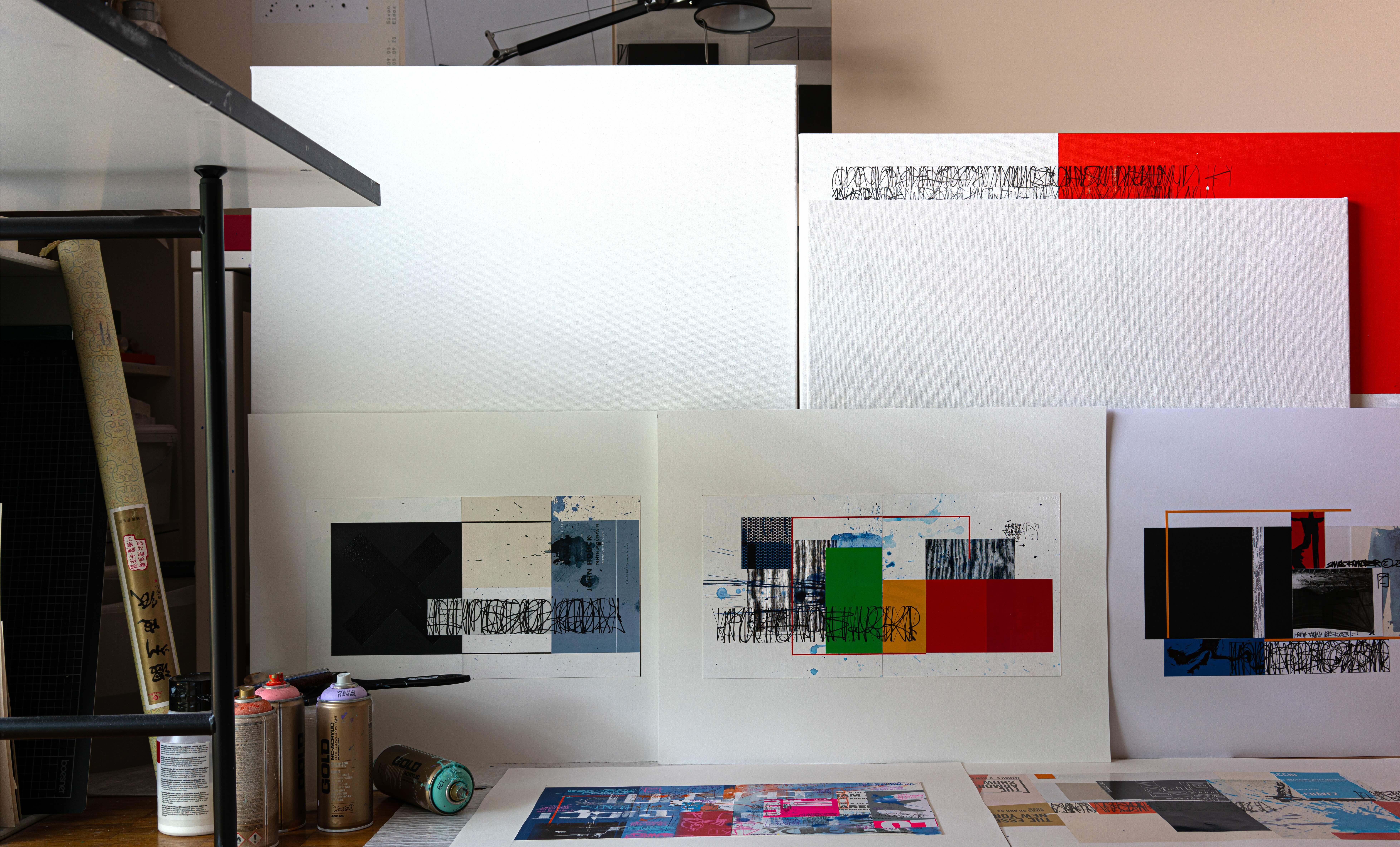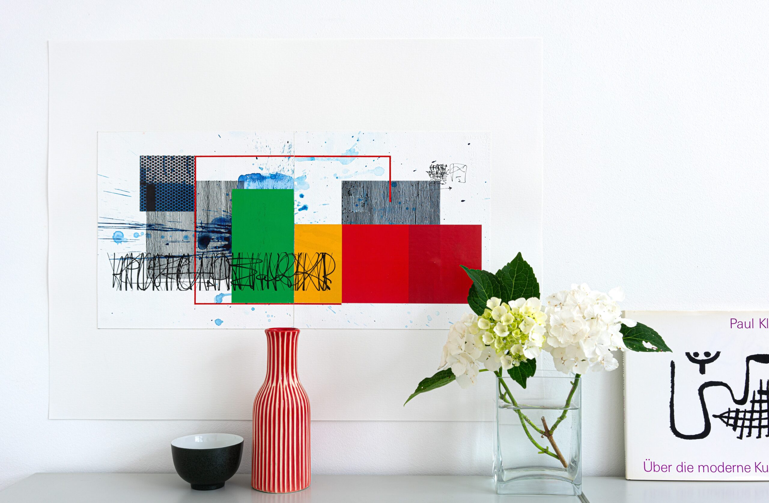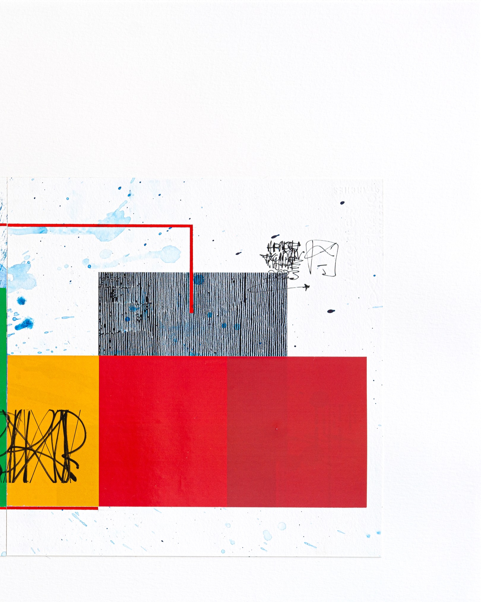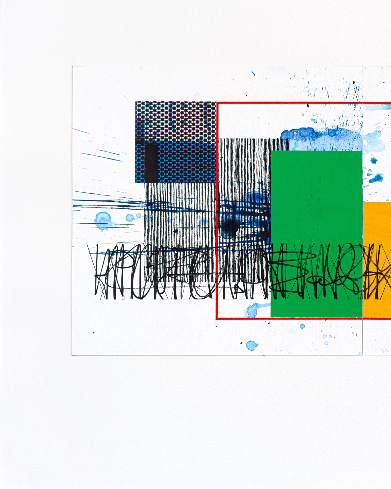 This work is done on 300 gsm Arches paper and includes collages. The composition balances bright colors and graphic areas.