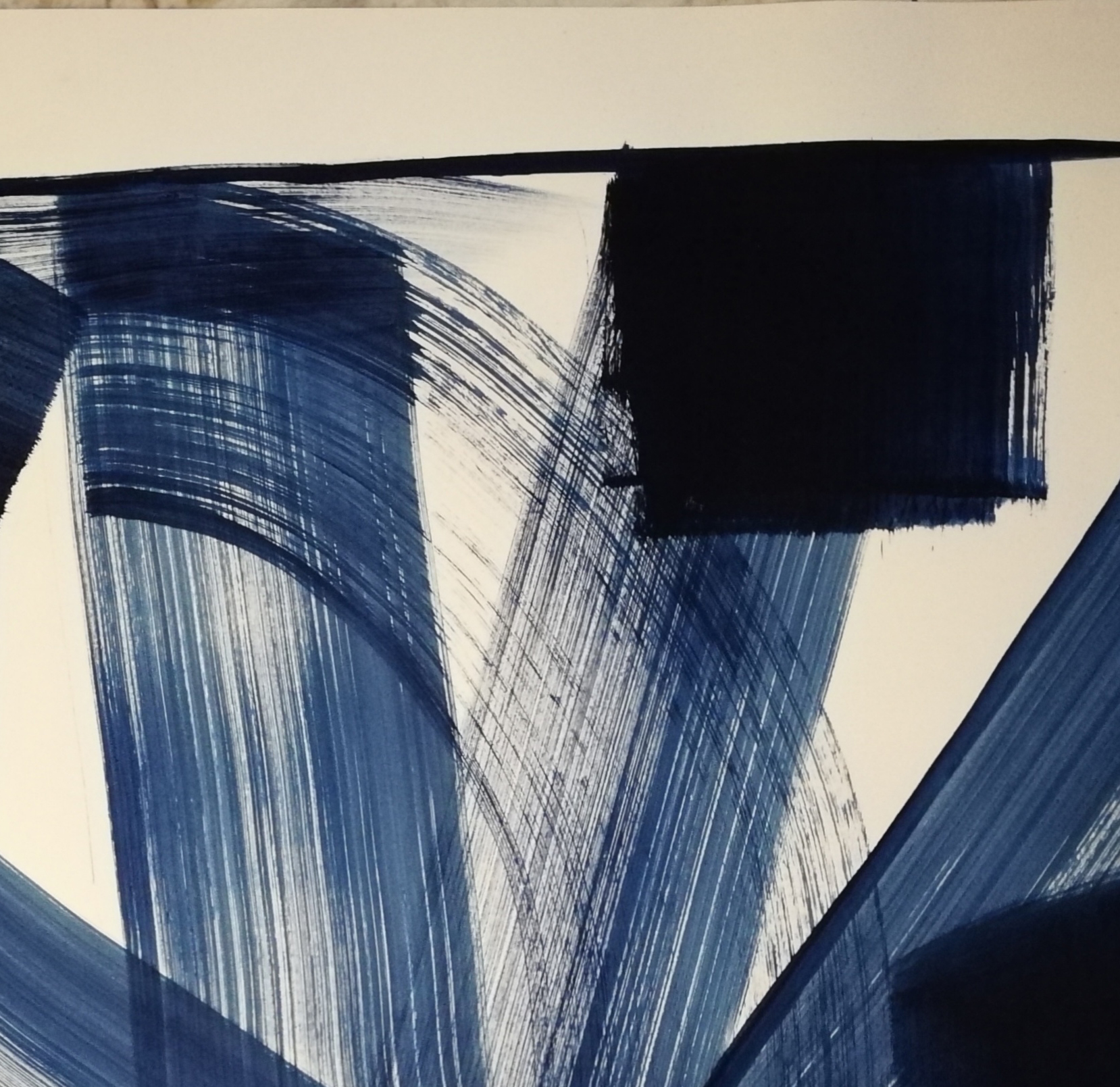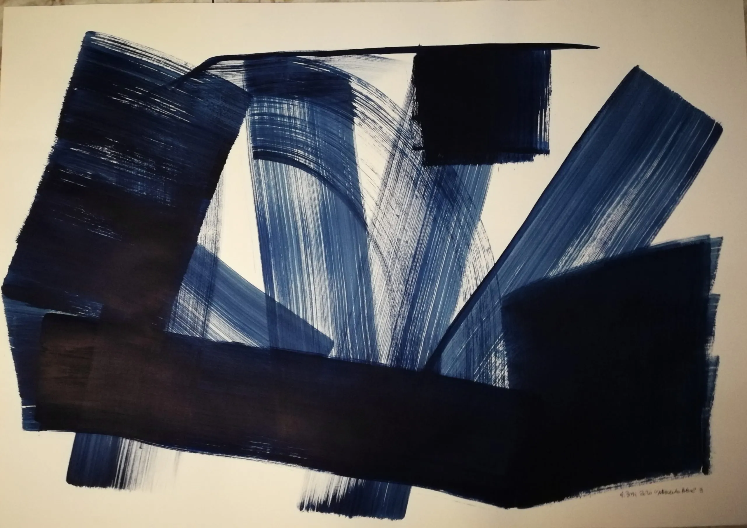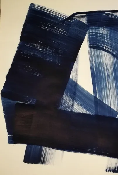 The work is painted with blue pigment on paper. It is composed with the strokes of a large brush. It is not a gestural creation. The painting is premeditated and executed without second thoughts on the support. The single color creates both the form and the voids. The voids, the surface of the paper, have ambivalent meaning and are an essential part of the composition.