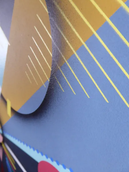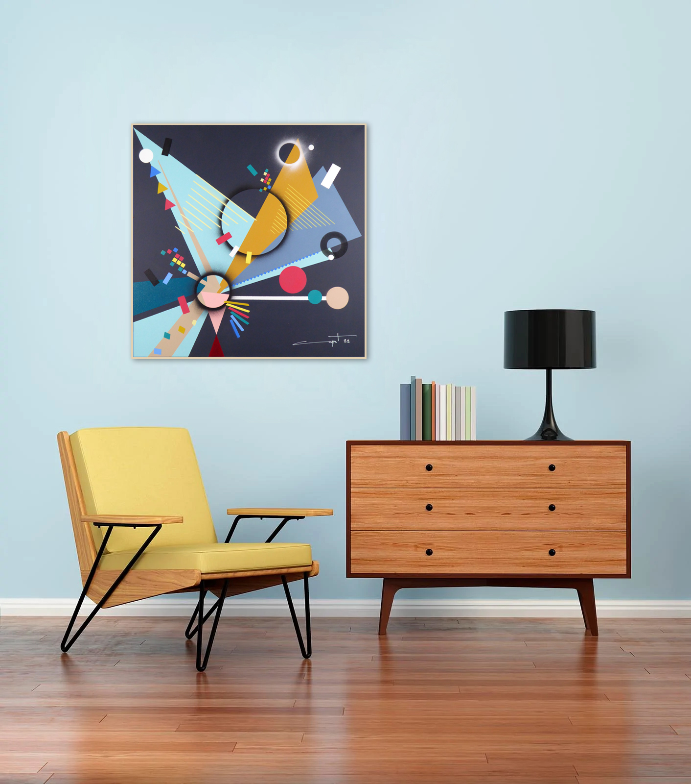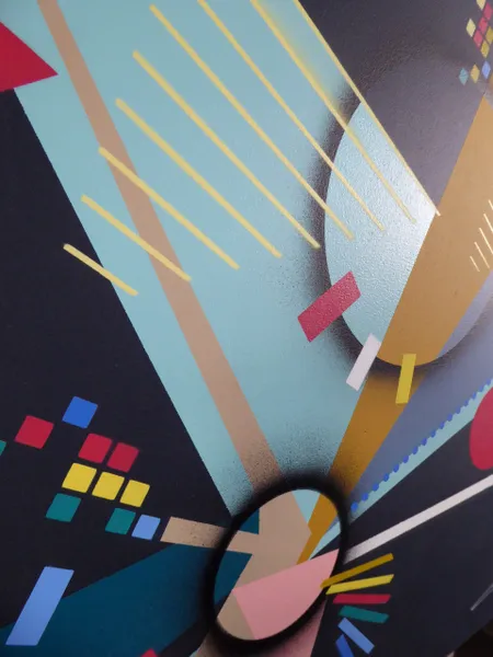 Cette œuvre d'art abstraite déploie une explosion de formes géométriques dynamiques et de couleurs vives sur un fond sombre. Les triangles et cercles s'entrelacent, créant une impression de mouvement constant. Les teintes audacieuses – bleu, jaune, rouge, et rose – sont judicieusement disposées, formant un équilibre visuel saisissant.