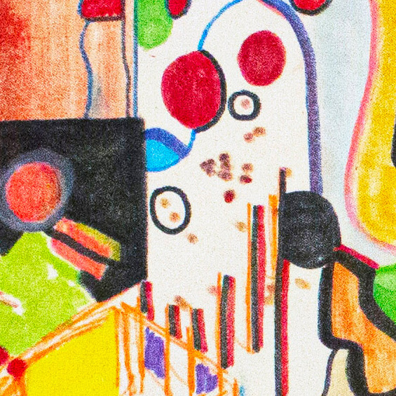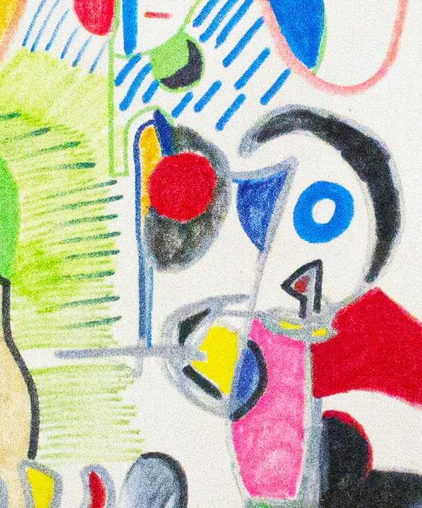 This work is created through an intuitive process of automatic drawing, where fragmented forms accumulate into a dense, cavern-like space. Influenced by Surrealist automatism, Miró’s playful abstraction, and narrative imagery, the composition layers bold color blocks with raw line work. Varied textures, visible pencil strokes, and spontaneous mark-making generate a sense of discovery, movement, and hidden inner worlds unfolding across the surface. This workwill ship in a tube. Not stretched.