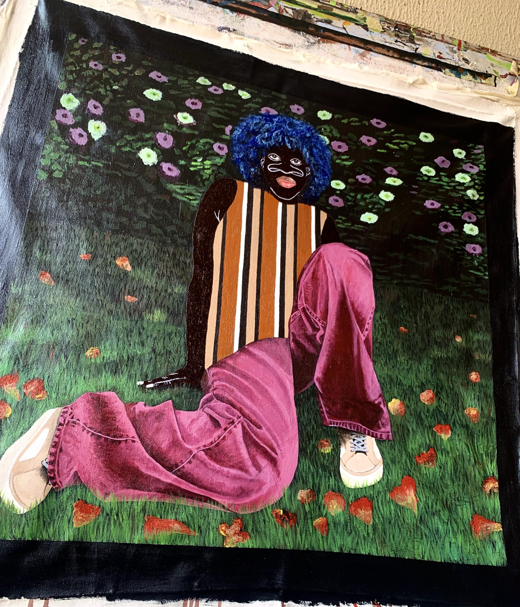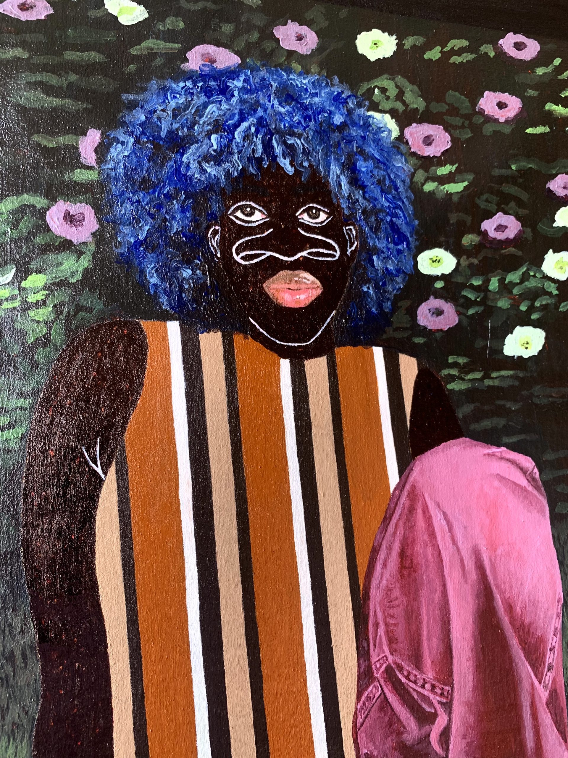 Its a celebration of individuality and style, unafraid to mix bold colors and patterns in a way that challenges traditional portrait norms. There’s a vibrant, almost rebellious joy in the pairing of cobalt hair, magenta pants, and floral surroundings it suggests a refusal to blend in, a delight in being unmistakably visible.