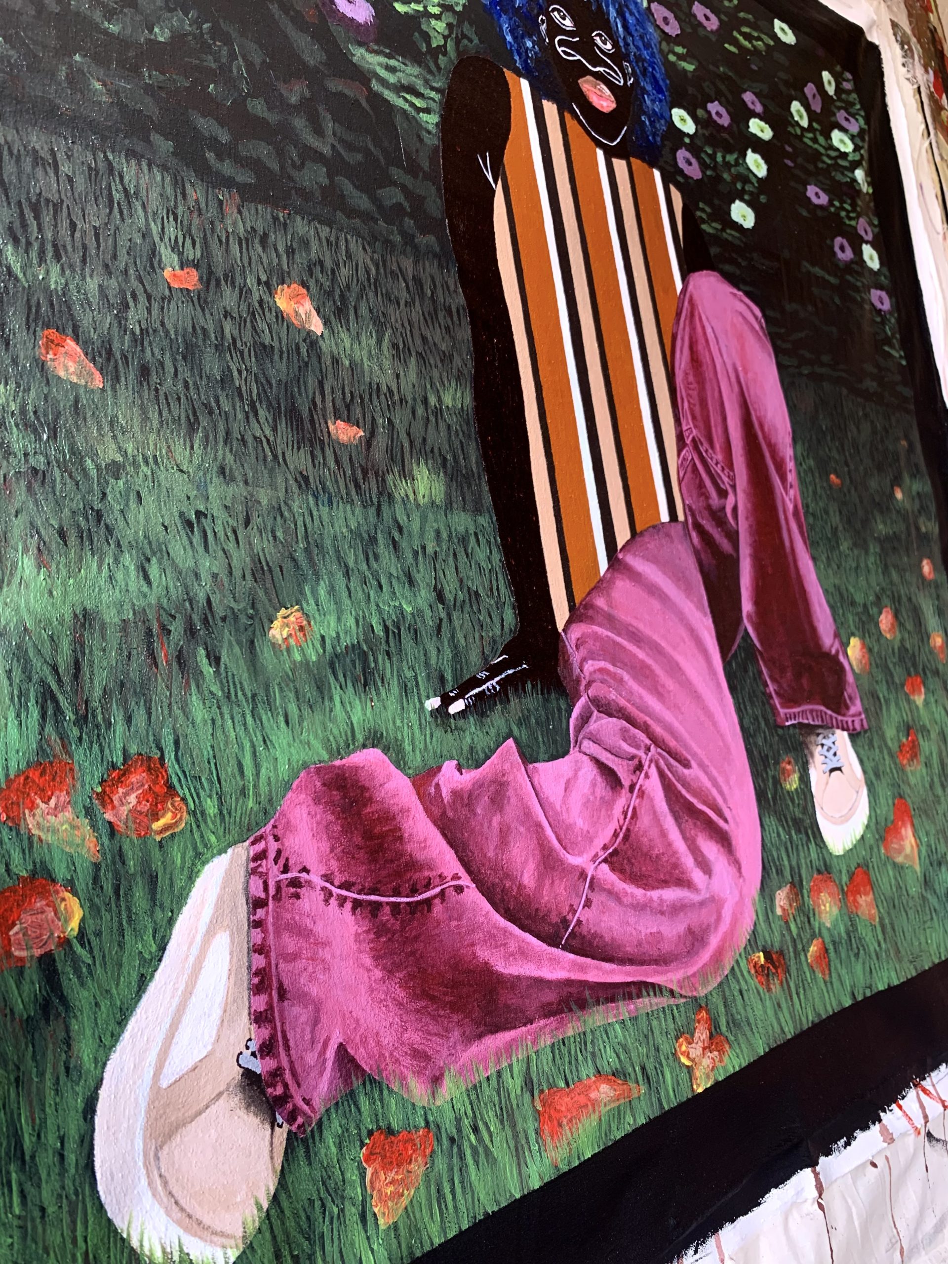 At the same time, the serene garden setting softens the scene, hinting at themes of harmony between self-expression and the natural world.