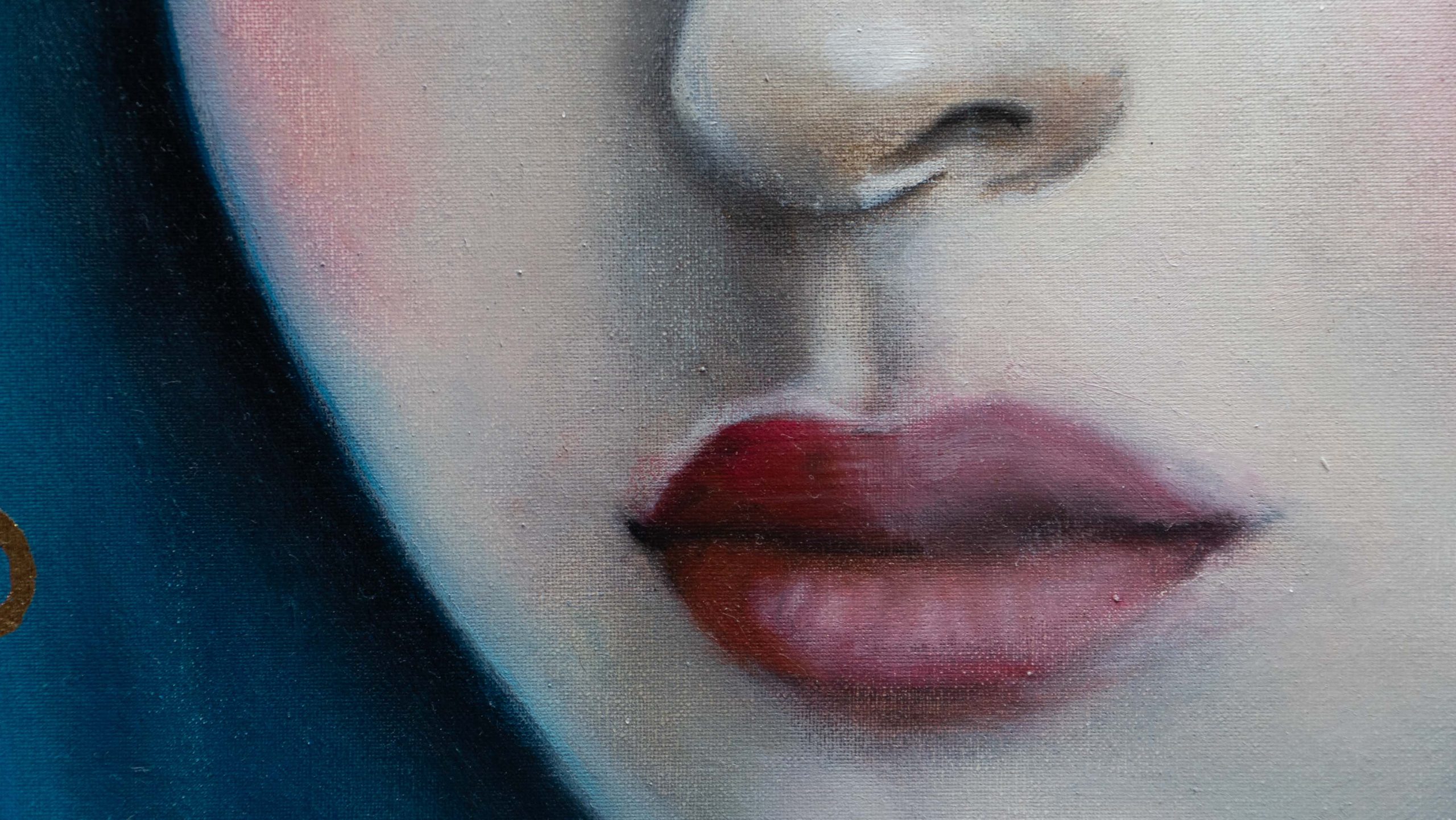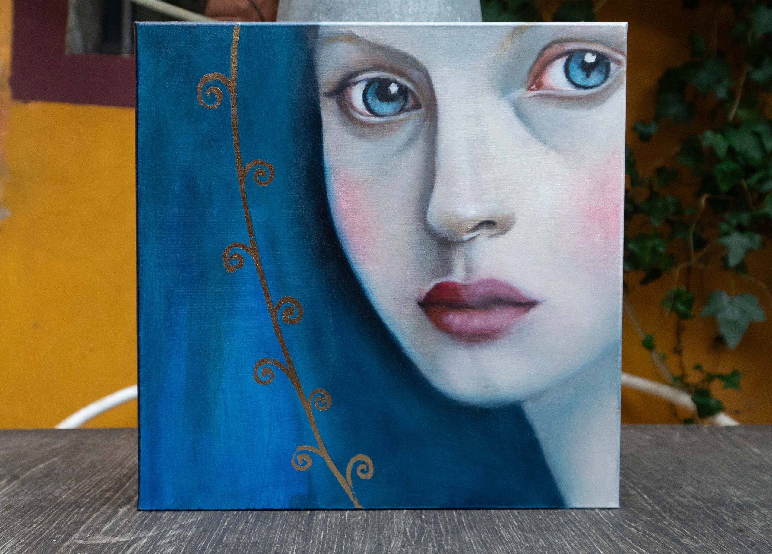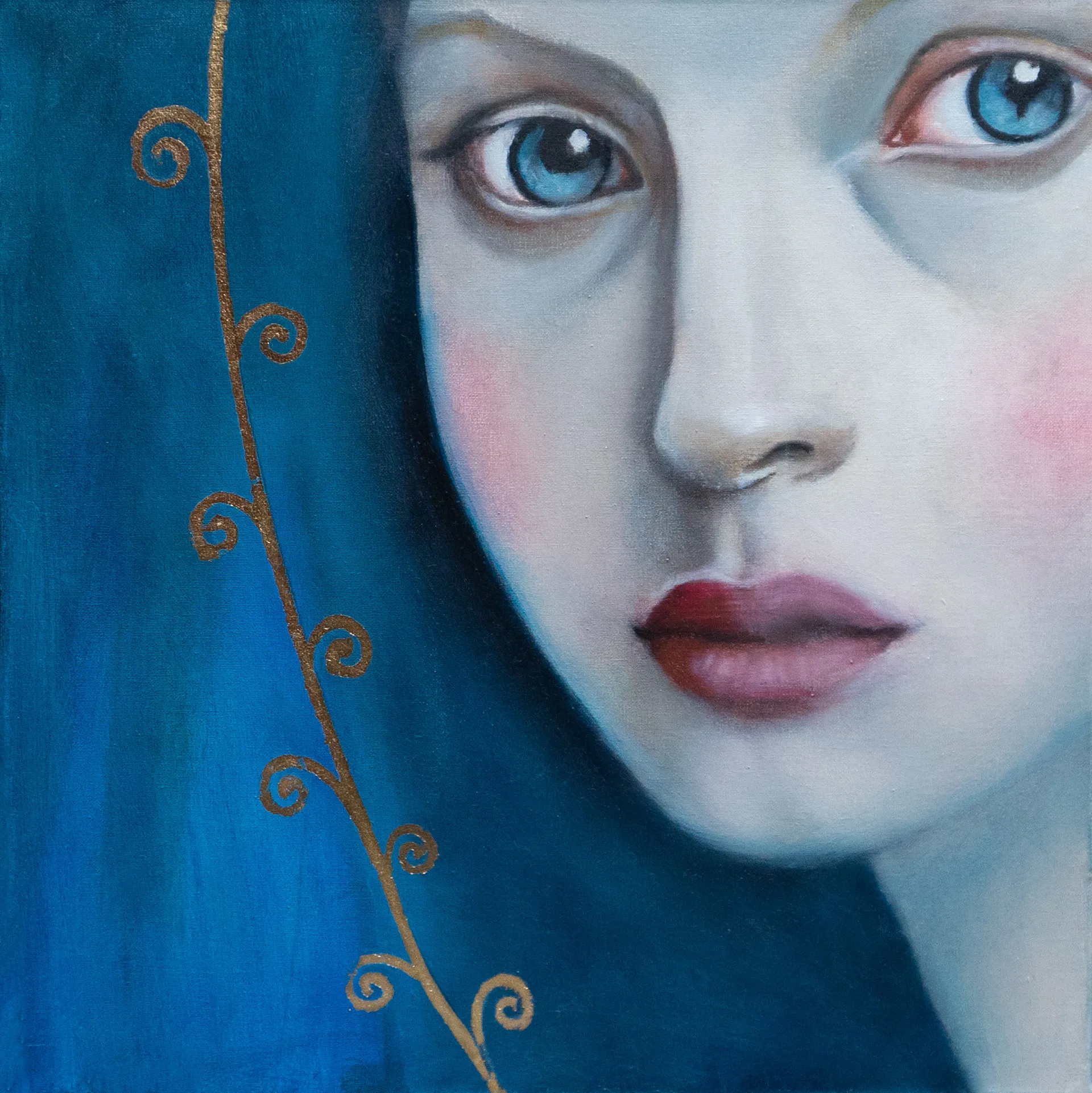 In questo dipinto ho cercato di catturare l'intimità di uno sguardo sospeso tra realtà e mistero. L'accenno di doratura rimanda all''amor cortese", poesia di altri tempi.