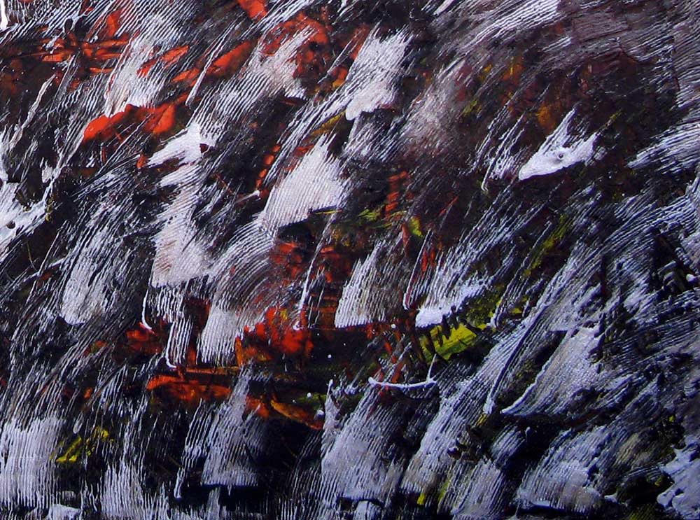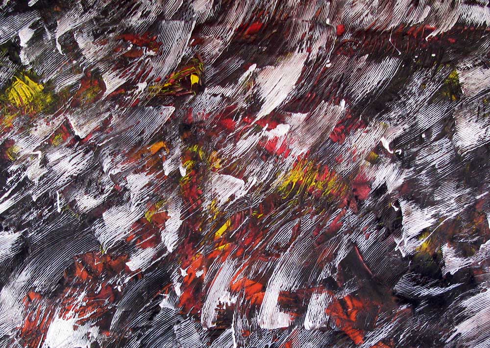 Bold and wide brushstrokes in tones of white, black and red create a rhythmic pattern on the canvas, which evokes chaotic waves or a stormy sky. Subtle yellow touches emerge from darkness, adding depth and intrigue to the composition. The piece moves between frenzy and order, immersing the viewer in its fascinating whirlwind. It is a shocking show of movement and emotion, where each brushstroke evokes vigorous energy. The use of contrast and overlap techniques provides a tactile quality.