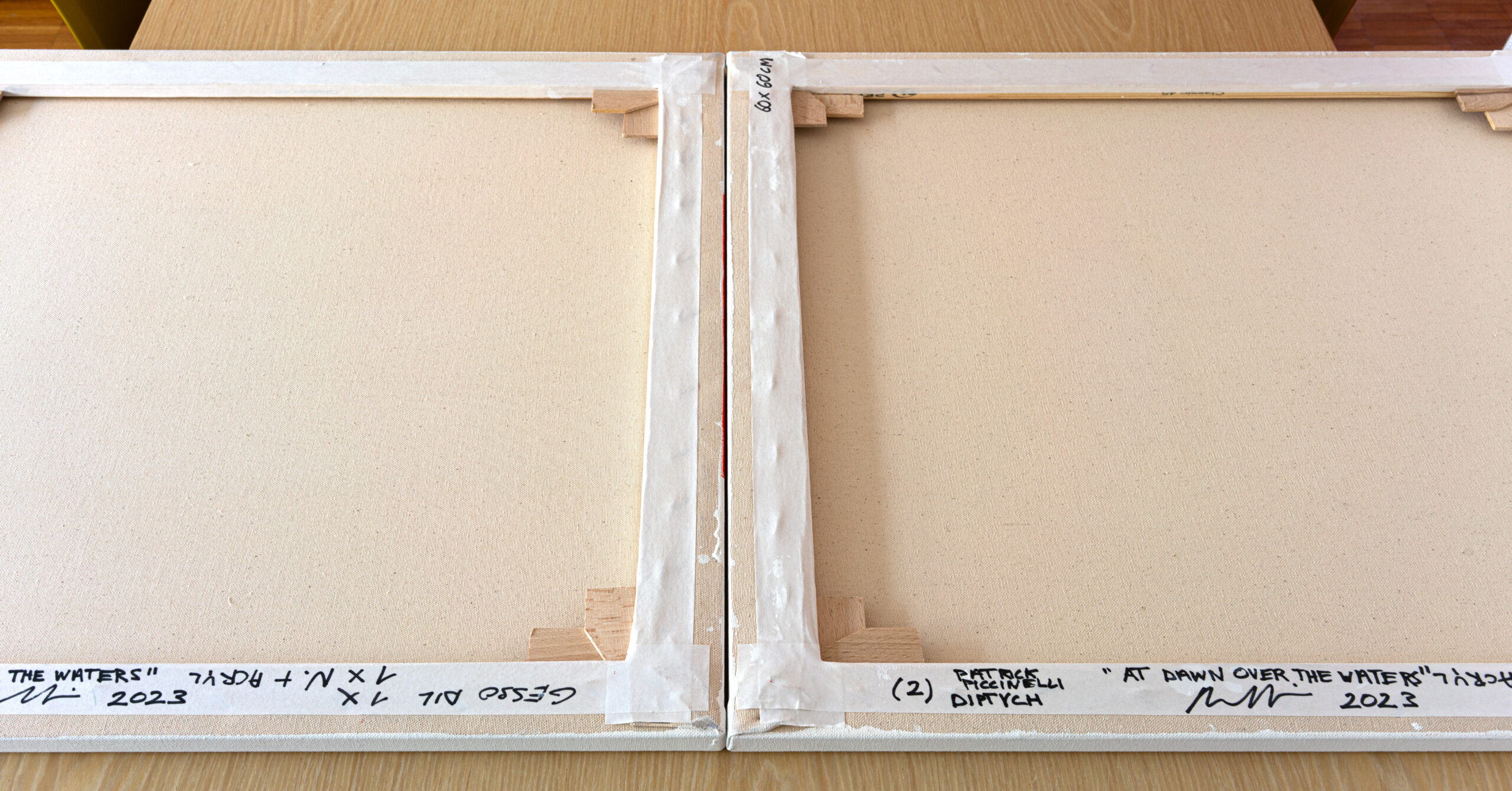 The sun is beginning to rise. I love this time of day. I watch the sky lighten as I contemplate the landscape. Water is associated with life, purity, and dawn. For me, dawn represents hope, birth, and renewal. This work is a diptych, created on two 60x60 cm canvases. The composition, in two distinct yet visually connected parts, represents a visual metaphor for transition. Just as dawn is the transition from night to day.