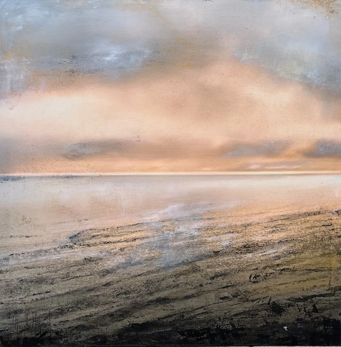 Murielle Argoud, an artist with French and Andalusian roots, comes from Lyon, where she began painting at a young age. Trained across Europe in the 1970s and 1980s—from France and Germany to Switzerland and Tuscany—she chose to step away from theory and draw her inspiration directly from nature. Her works blend oil and acrylic with materials such as lava, sand, gold leaf, and collage, creating powerful, textured compositions where natural forces—winds, snow, waterfalls, and glowing night skies—meet a vibrant, mystical light. Known for combining dramatic surfaces with a soft, poetic atmosphere, she has exhibited in over 50 solo shows and international art fairs, including New York and Venice. Her works are held in private and public collections, and even in a chapel in Geneva. Constantly seeking new horizons, she feels at home wherever art and inspiration meet.