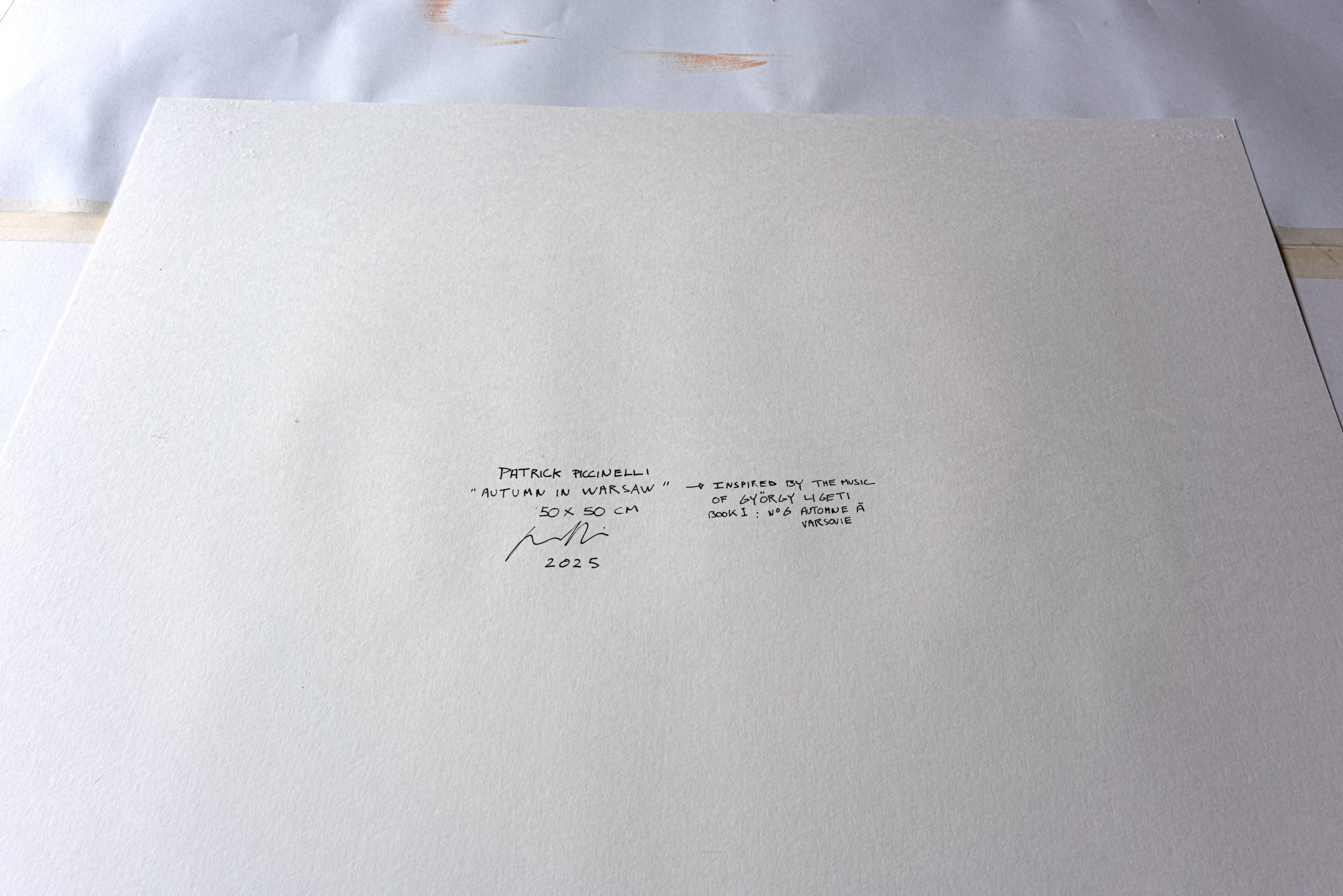 This work on paper establishes a dialogue with György Ligeti's piano piece “Autumn in Warsaw” (Piano Studies, Book 1, No. 6, 1985).Warsaw in autumn bears the weight of 20th-century European history. Ligeti, a Hungarian composer who survived the Holocaust, imbues his music with a deep historical consciousness without resorting to illustration. I do the same: my work suggests rather than represents, creating an atmosphere charged with unresolved tensions.