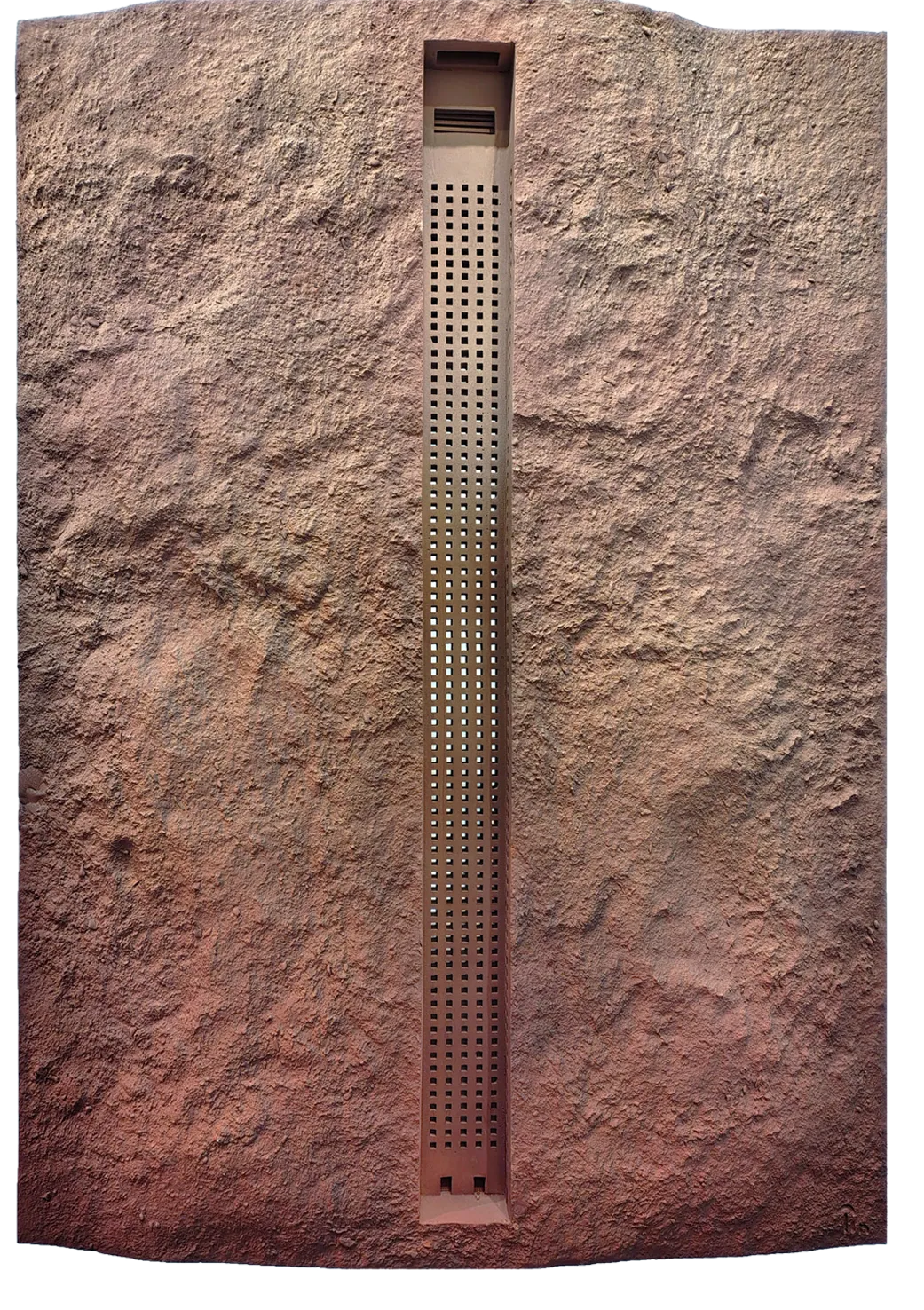 Esta obra inspirada en la arquitectura brutalista esconde una gigantesca construcción escavada en la roca y nos crea interrogantes acerca de su origen, sobre sus constructores y el porqué esta edificación fue abandonada. El diseño futurista de esta pieza sugiere una ventana hacia un mundo fascinante. La obra contiene una pequeña figura a escala 1:220 que consigue que la naturaleza se nos muestre sobredimensionada y por lo tanto la edificación se nos revele en su verdadera dimensión.