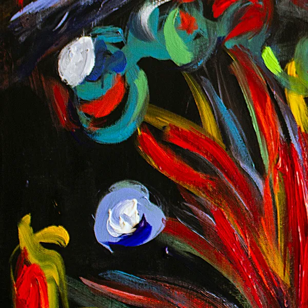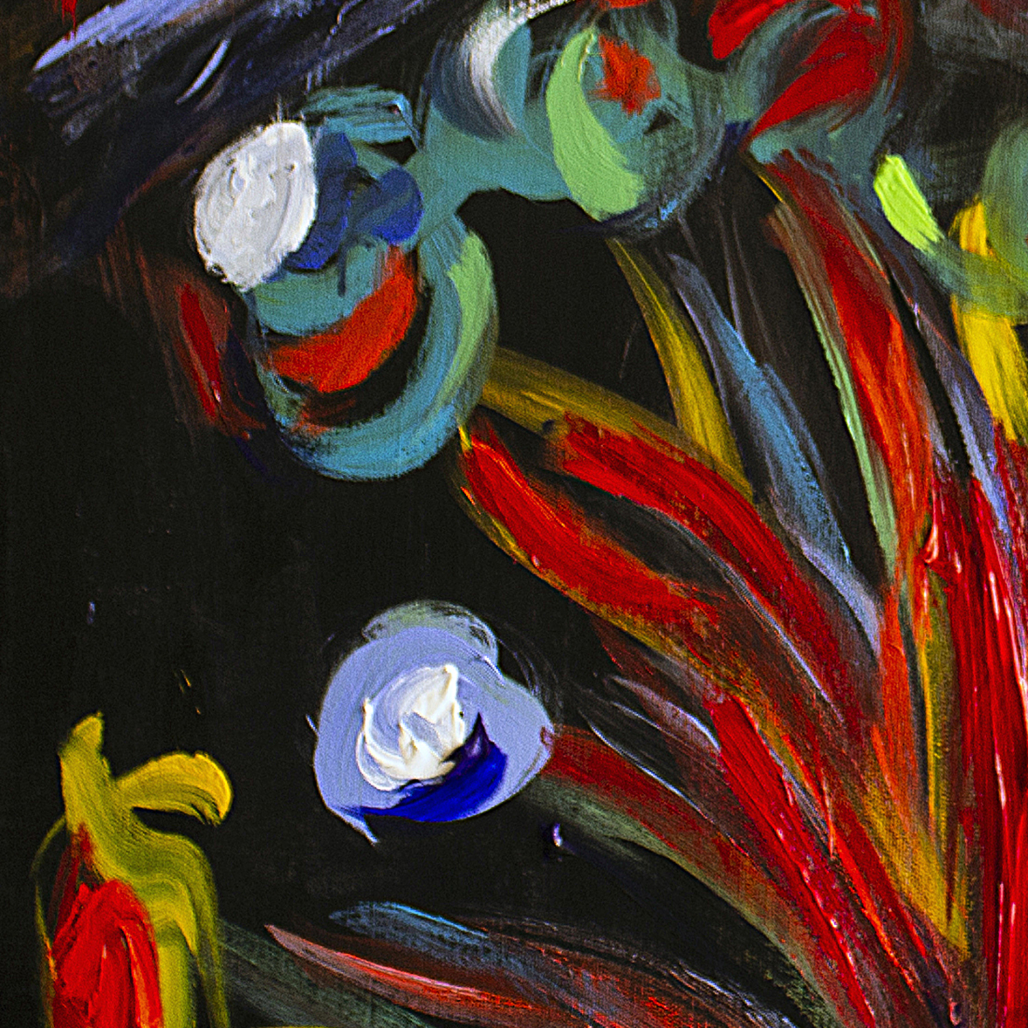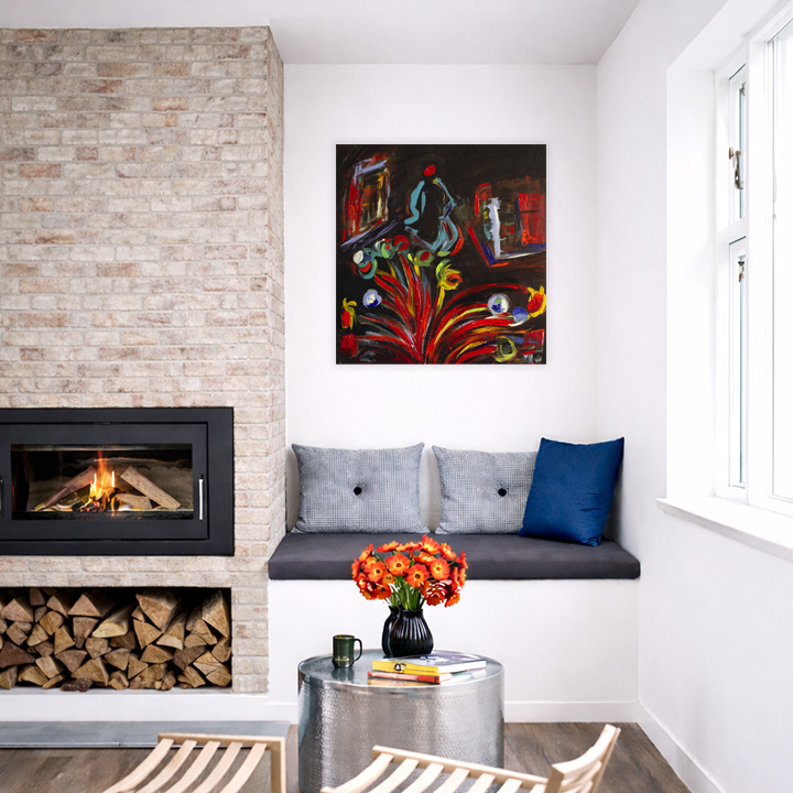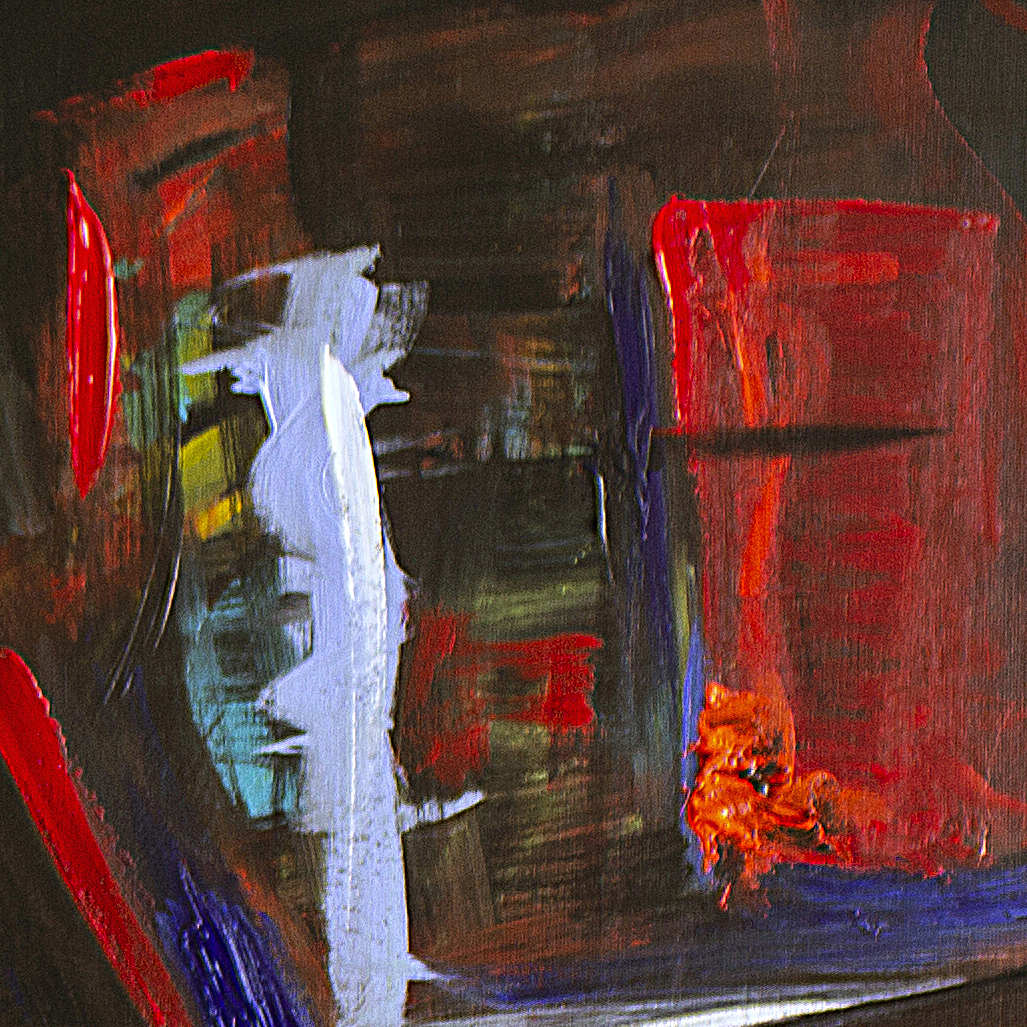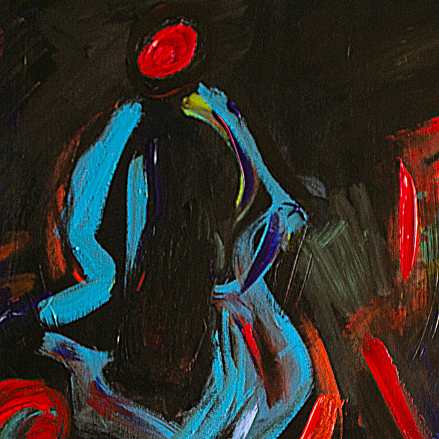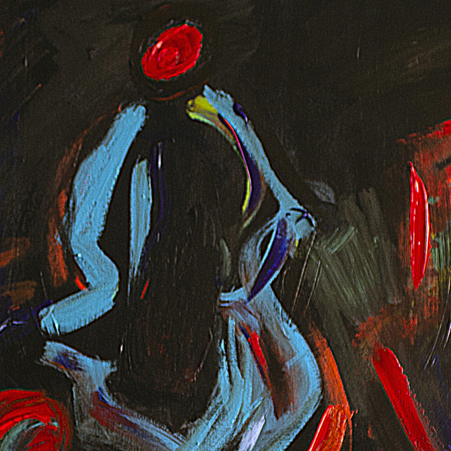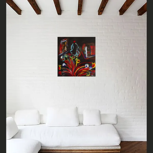 A luminous blue figure emerges from a dark, almost architectural space, crowned by a red halo that evokes awareness, pulse, or inner ignition. From the lower body, explosive strokes of red, yellow, and green unfold like flowers, fire, or emotional discharge. The contrast between shadowed surroundings and vivid color reflects an inner struggle between containment and release. Influenced by nocturnal introspection and raw emotion, the painting is created with layered acrylics.