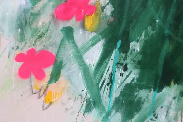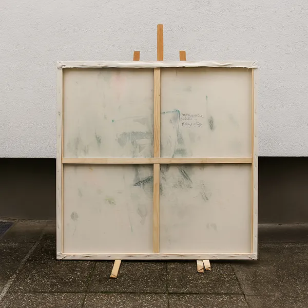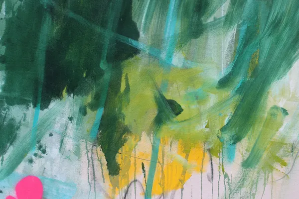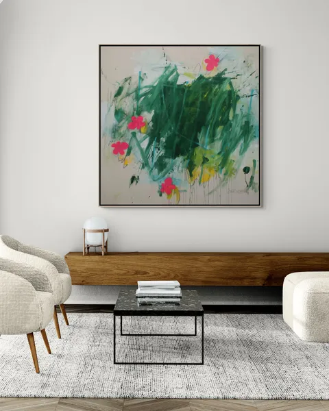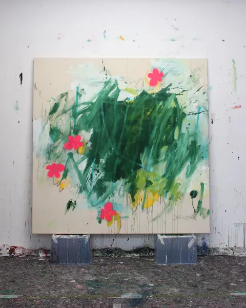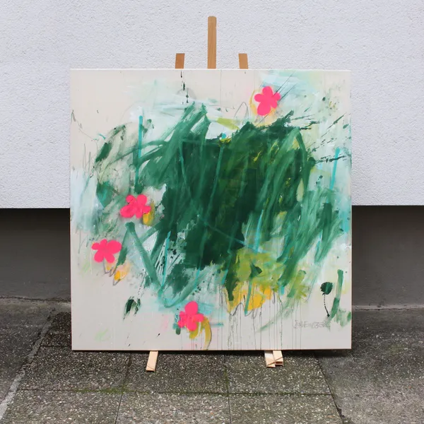 BLUMENWIESE 3 is a large contemporary abstract painting inspired by the vitality of a flowering meadow. Expressive green layers form a dynamic ground, punctuated by vivid neon pink floral accents. Created through an intuitive, physical process on raw canvas, the work reveals rich texture, movement, and traces of evolving gestures. Acrylic mixed media on raw canvas, 150 × 150 cm.