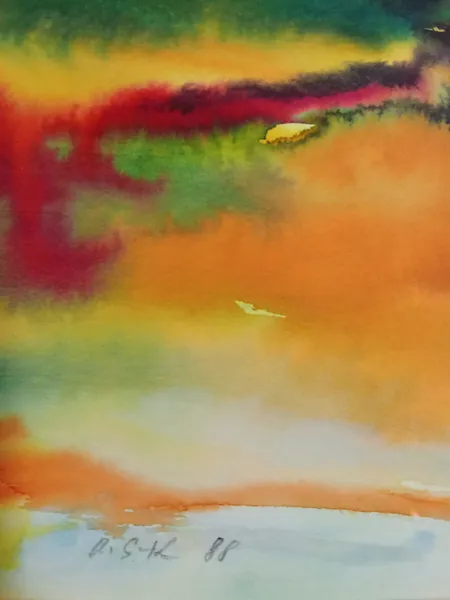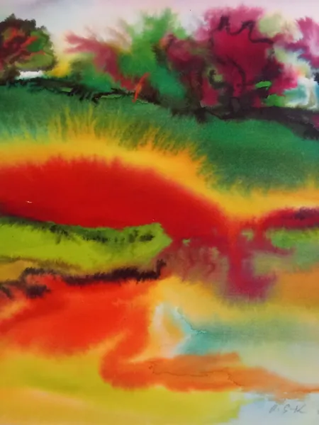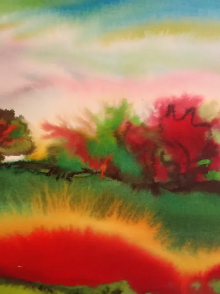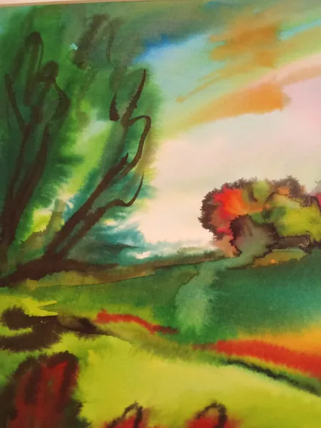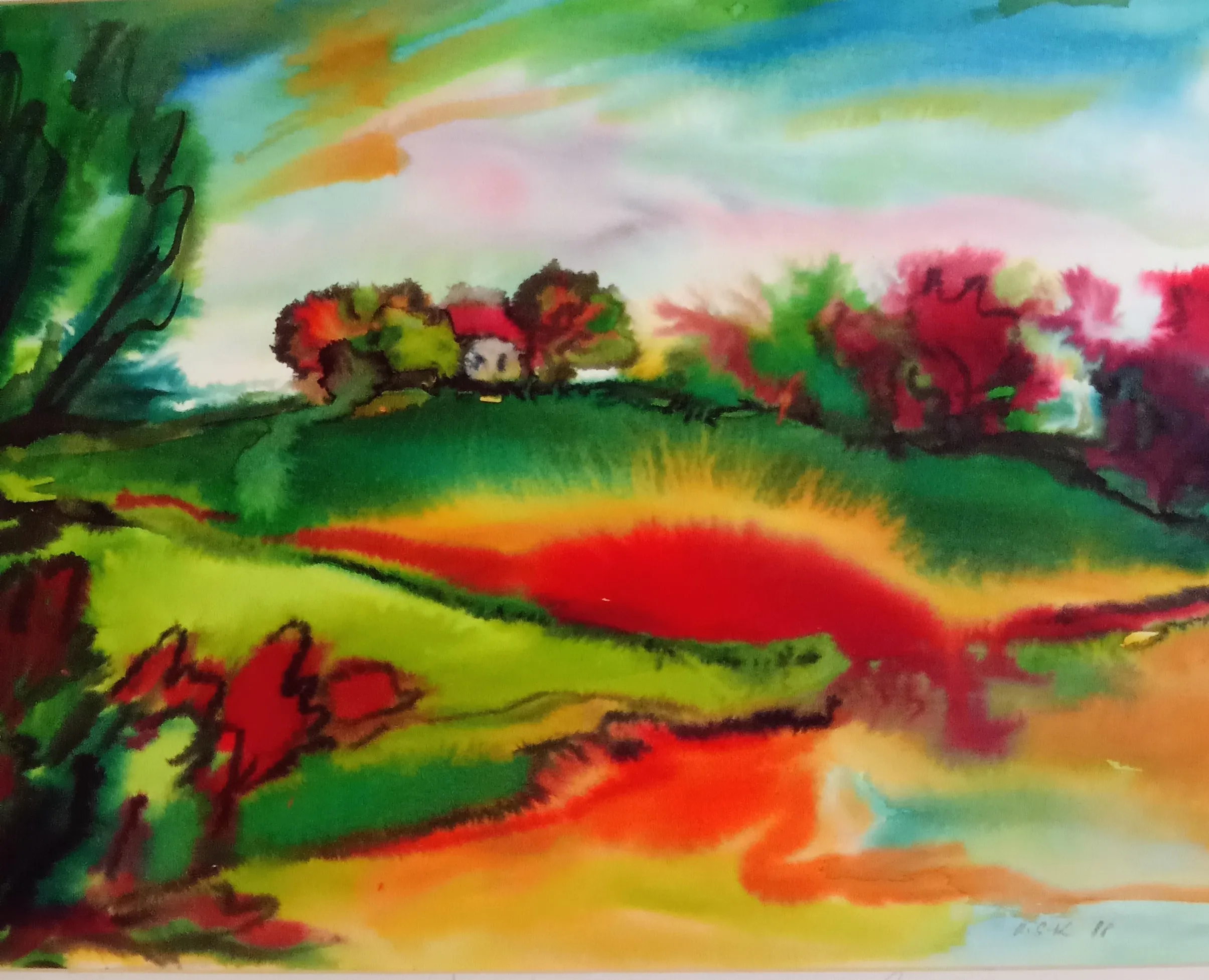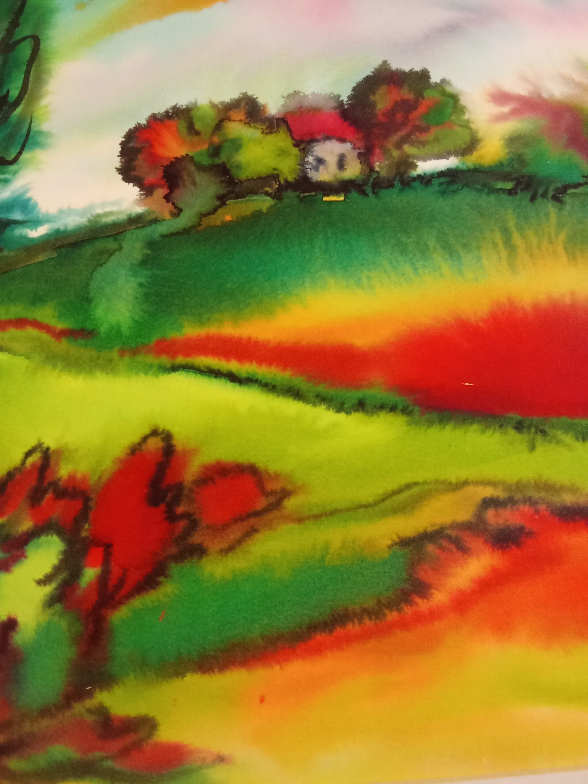 Au travers de cette aquarelle j'ai cherché à capturer l'énergie vibrante et changeante de la nature en mêlant l'expressionnisme et une touche de semi-abstraite. Chaque couleur raconte une émotion intense, invitant à ressentir la chaleur et la vie d'un paysage en mouvement. C'est un souvenir d'enfance en Bohème du sud.