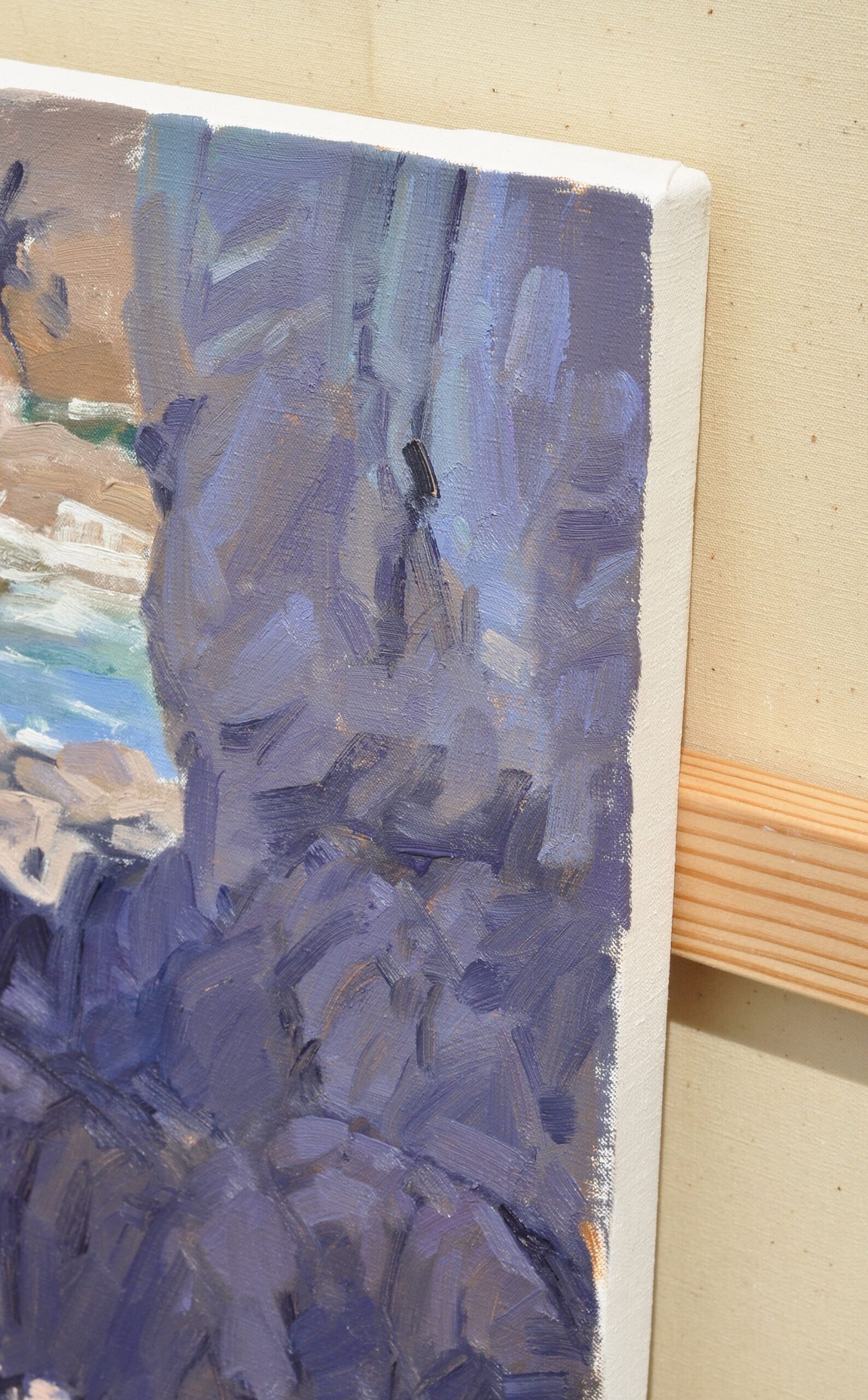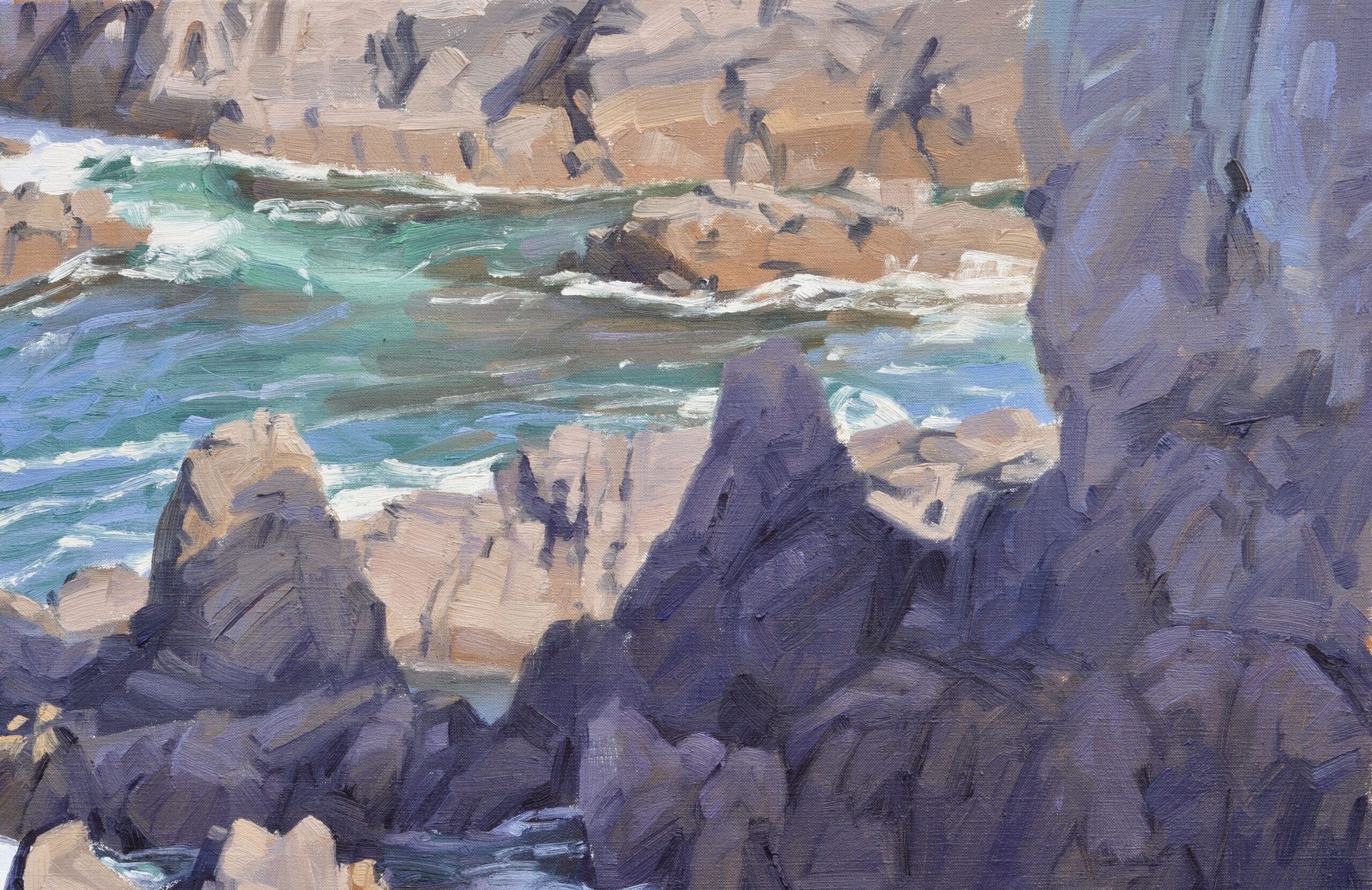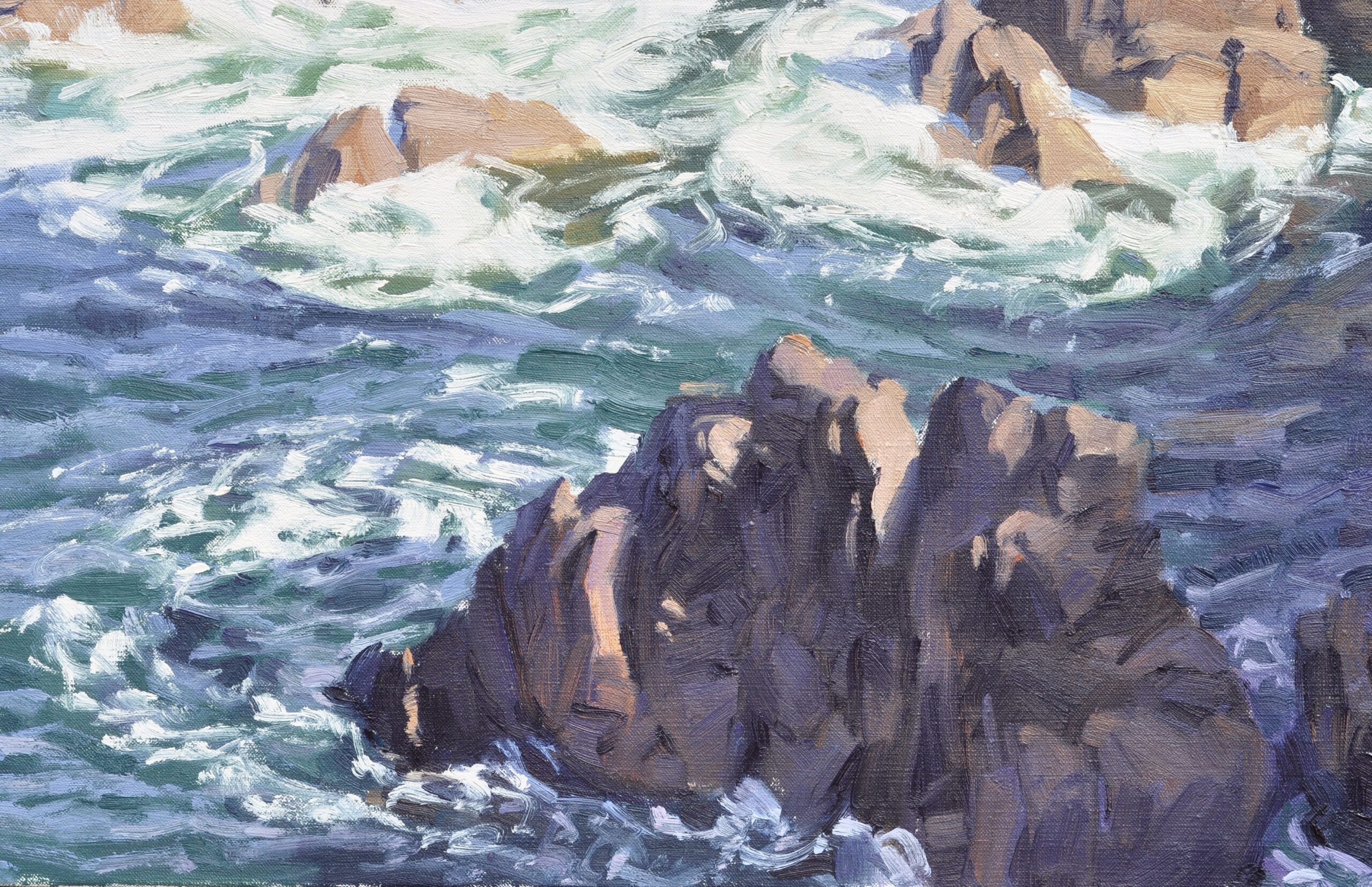 Brittany, France Brittany, the eternal muse of artists, continues to inspire me with its wild and untamed beauty. The interdependence of the elements is fascinating. The water, rocks, and light interact and challenge each other to form a scene that is both peaceful and powerful. There is a fluid dialogue between stillness and movement, between raw presence and the unleashing of elements. This artwork will be delivered ready to hang.