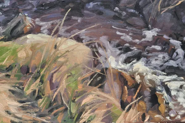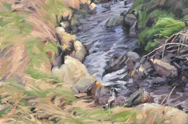 Cap Sizun offers a spectacular landscape of rugged coasts and steep cliffs plunging directly into the Atlantic. In this painting, I have tried to capture the winding stream that weaves between the cliffs, a continuous life current joining the ocean.