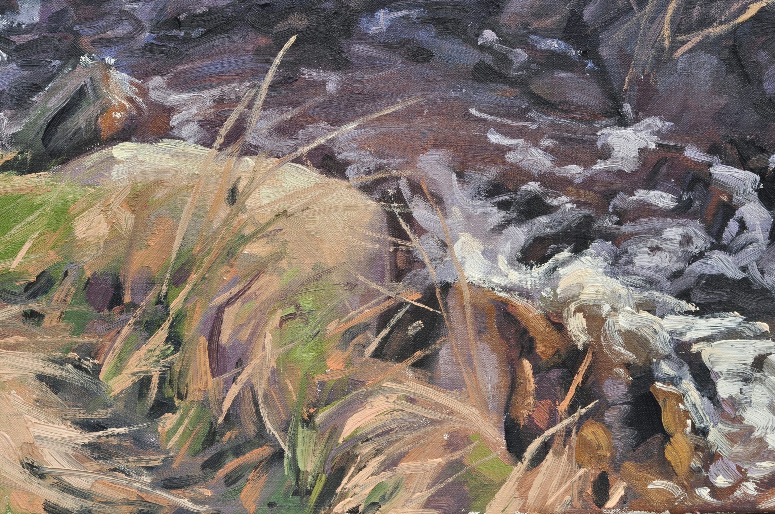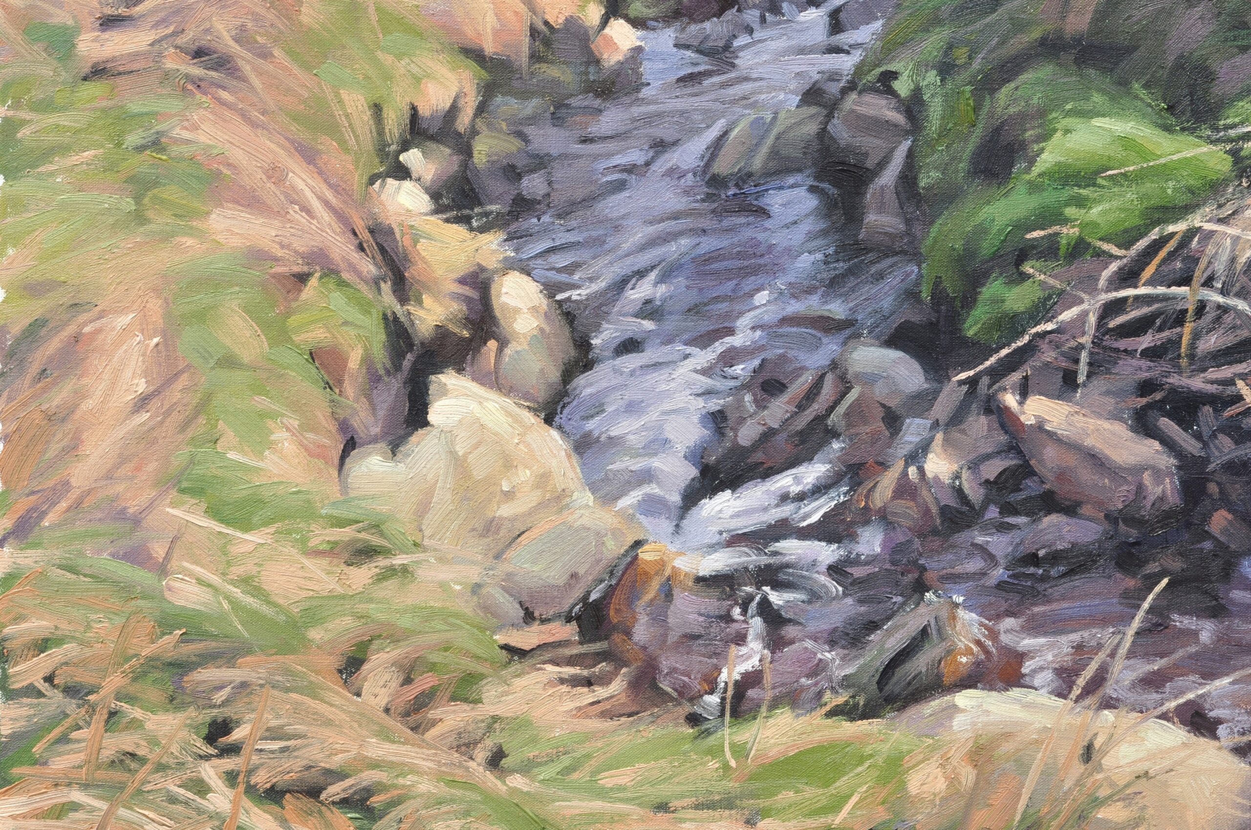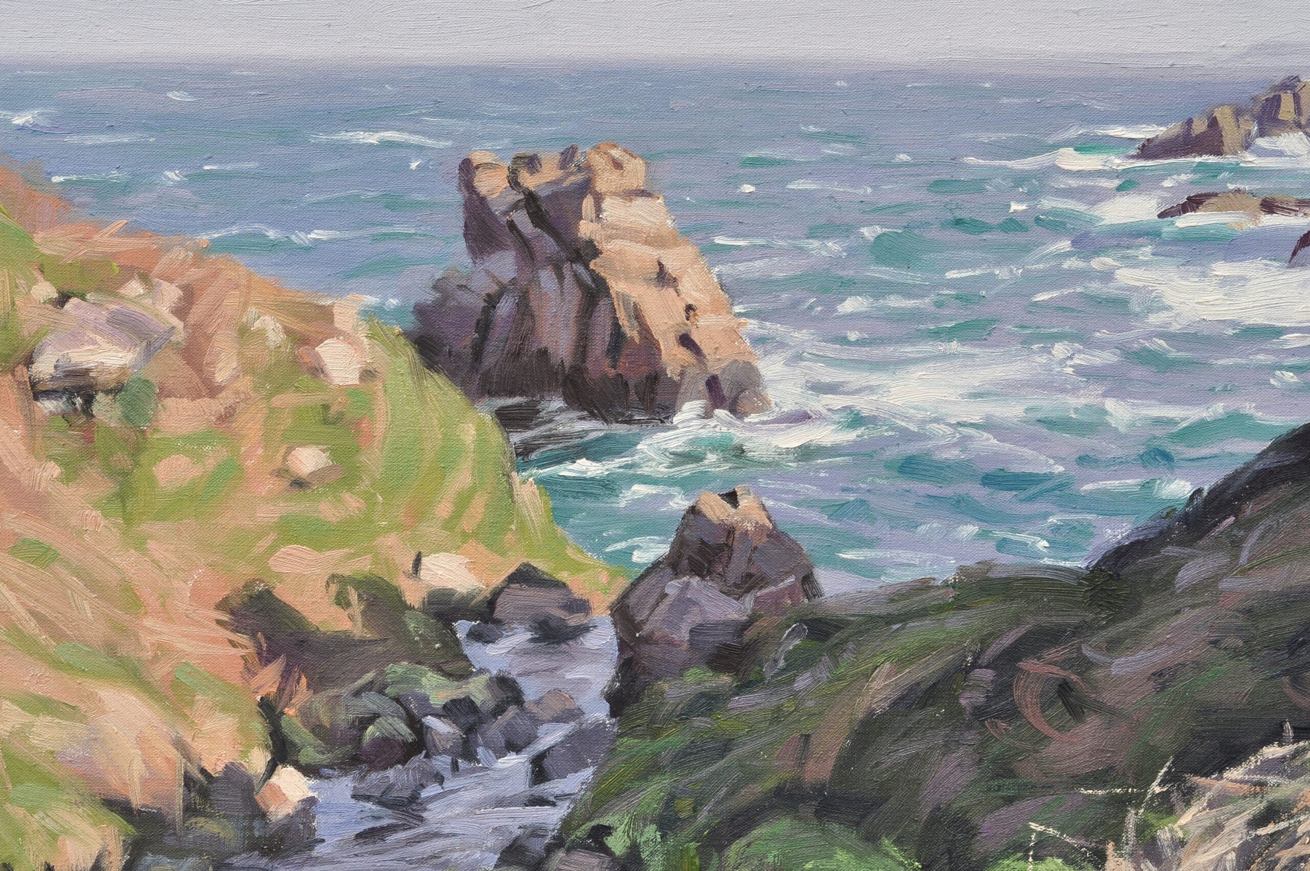 Cap Sizun, Brittany, France. Cap Sizun offers a spectacular landscape of rugged coasts and steep cliffs plunging directly into the Atlantic. In this painting, I have tried to capture the winding stream that weaves between the cliffs, a continuous life current joining the ocean. This artwork will be delivered ready to hang.