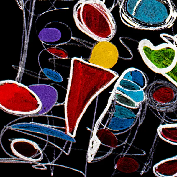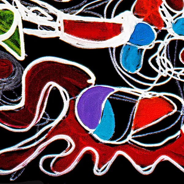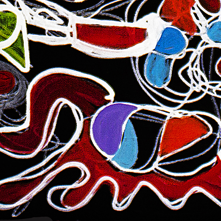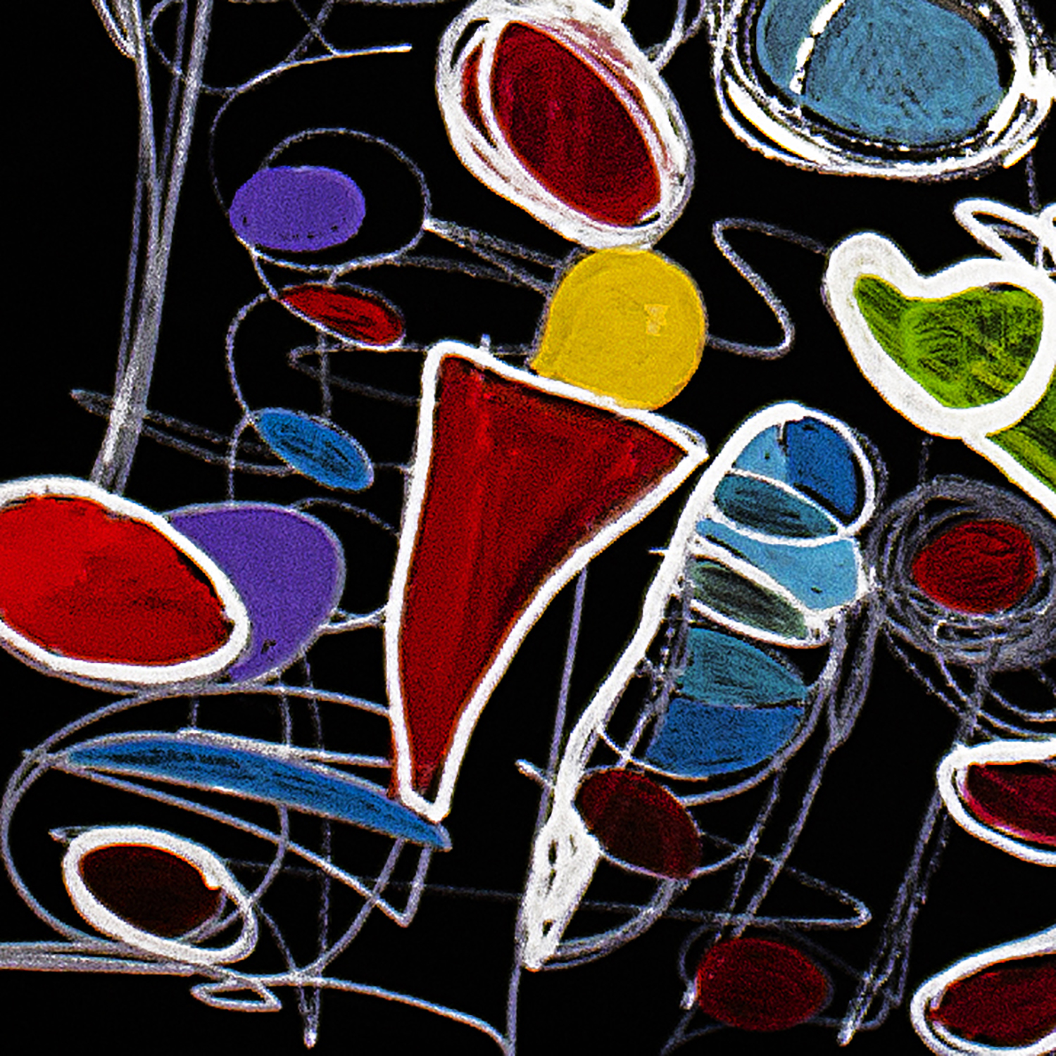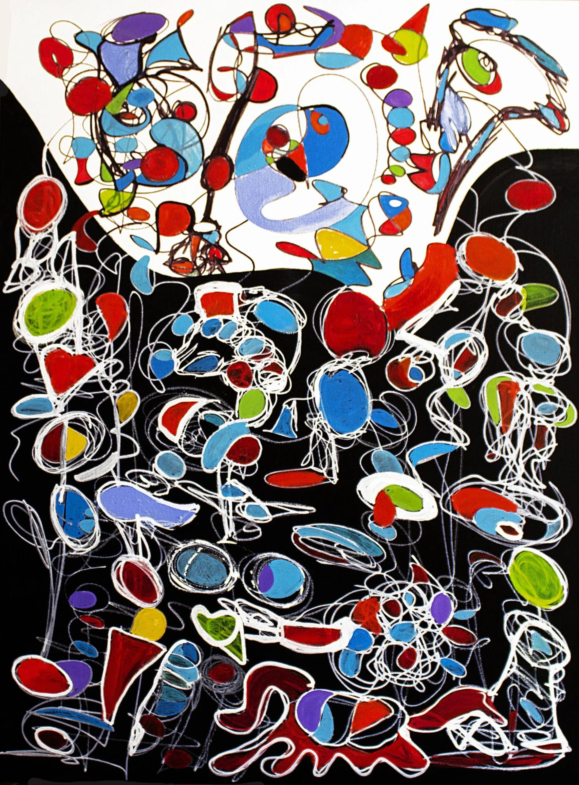 This painting unfolds like a luminous dance suspended against a deep black ground. Floating, biomorphic forms—resembling seeds, masks, and embryonic figures—are linked by nervous white lines that suggest breath, sound, or electrical flow. The contrast between vibrant reds, blues, and greens and the dark background evokes emergence from void into life. Influenced by music, calligraphy, and subconscious imagery, the work is built through layered acrylic shapes and gestural line work.