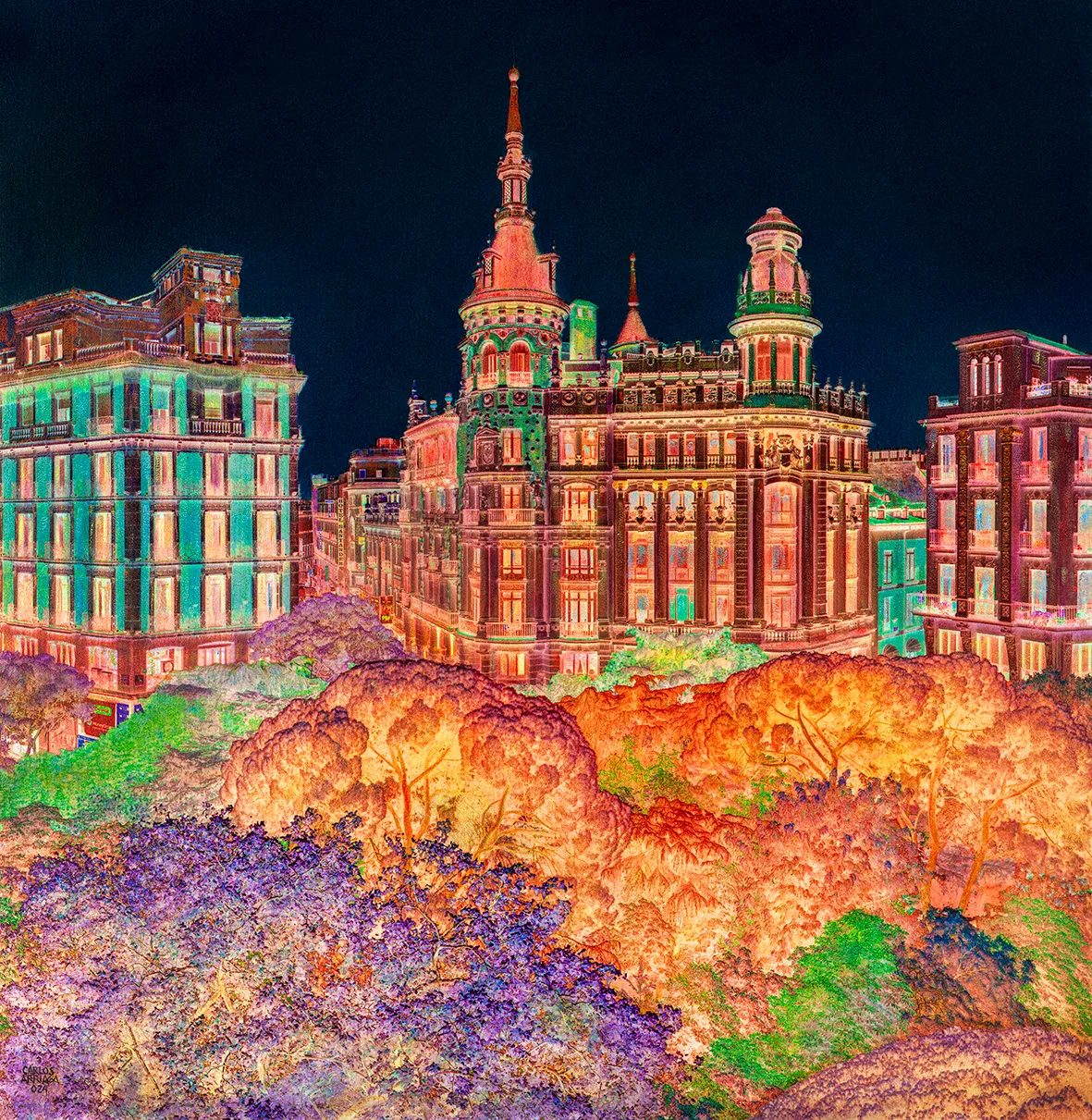 Using a self-developed technique, this work combines oil and pencil on black and white photographic grisaille. Inverted lights and colors create a dreamlike world, where thick textures and painterly strokes transform photography into a unique, expressive landscape.