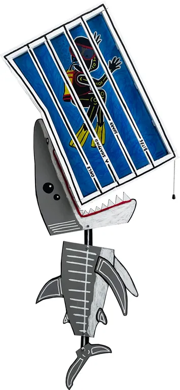 Discarded materials, especially reclaimed wood, form the foundation of his work. Not only for sustainability reasons but also for their raw, lived-in appearance, which adds depth to his compositions. He embraces the imperfections of the material and incorporates them into his expressive visual language, where cartoonish figures, skeletal forms, and animals frequently appear. His work is playful and colorful, yet beneath the cheerful exterior often lies a deeper, sometimes confrontational layer.