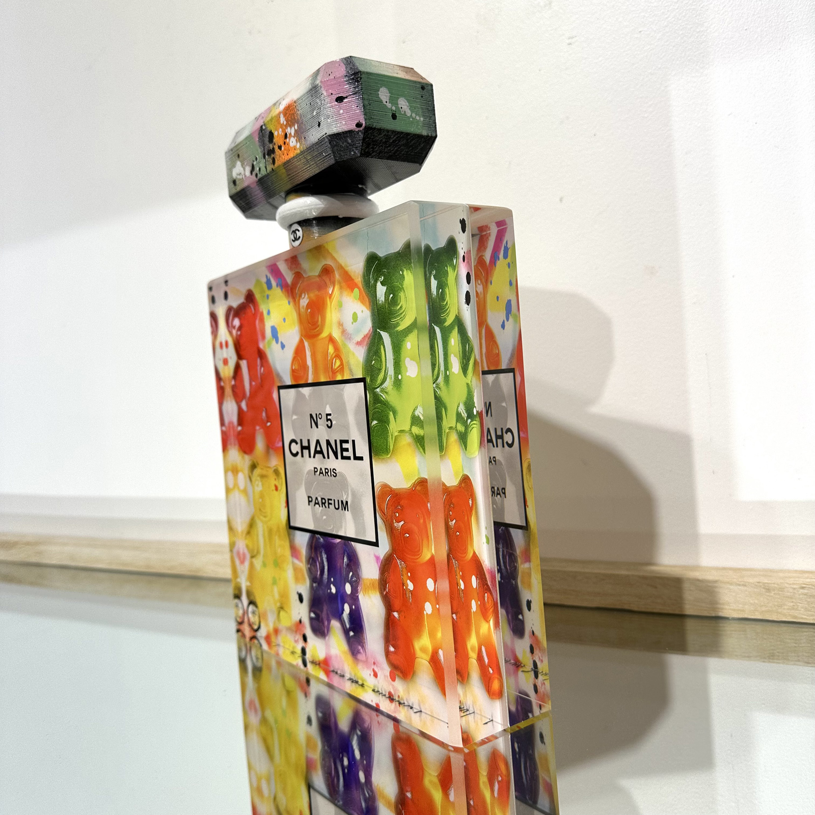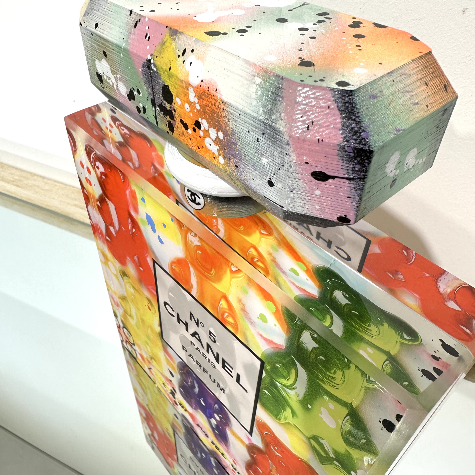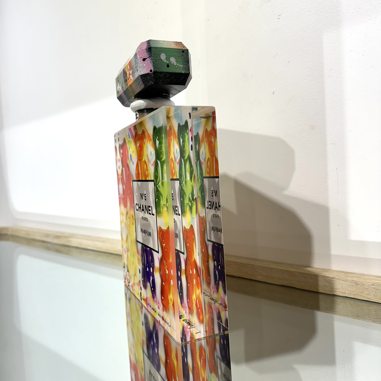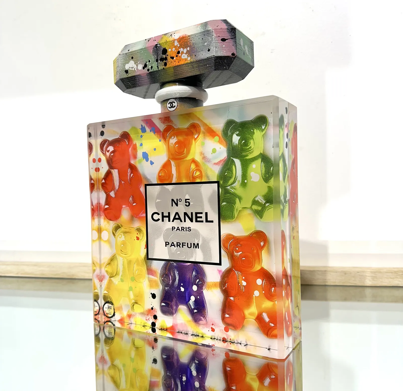 Dans cette œuvre "Chanel n°5 bottle, pop art gummy" j’ai exploré la fusion de la haute couture avec la culture populaire en encapsulant des oursons gélifiés colorés dans une résine transparente, imitant une bouteille de parfum Chanel N°5. J’utilise l’acrylique et le plexiglas pour accentuer la brillance et la clarté, créant un assemblage qui joue sur les contrastes entre luxe et ludique, tradition et modernité.