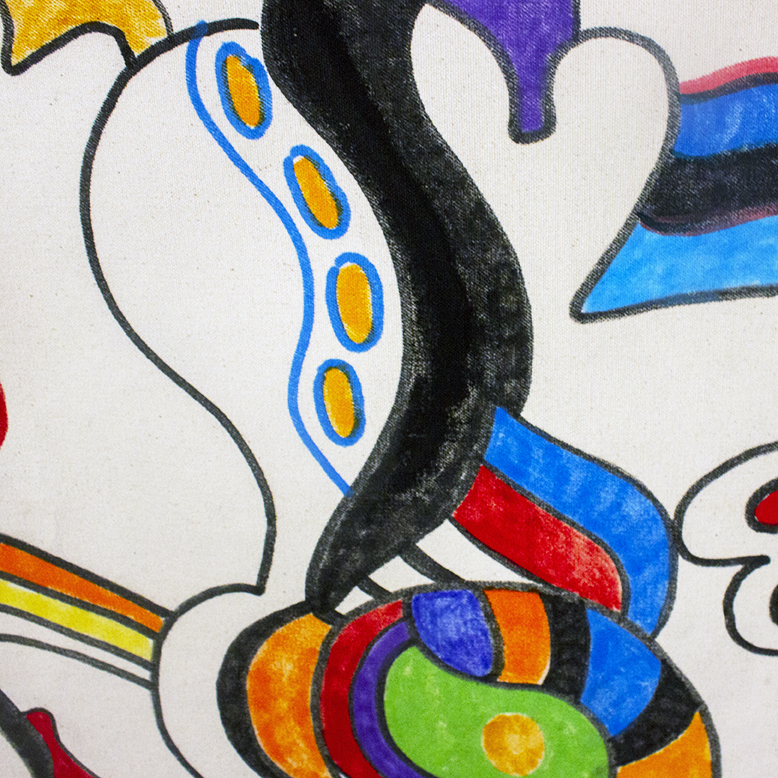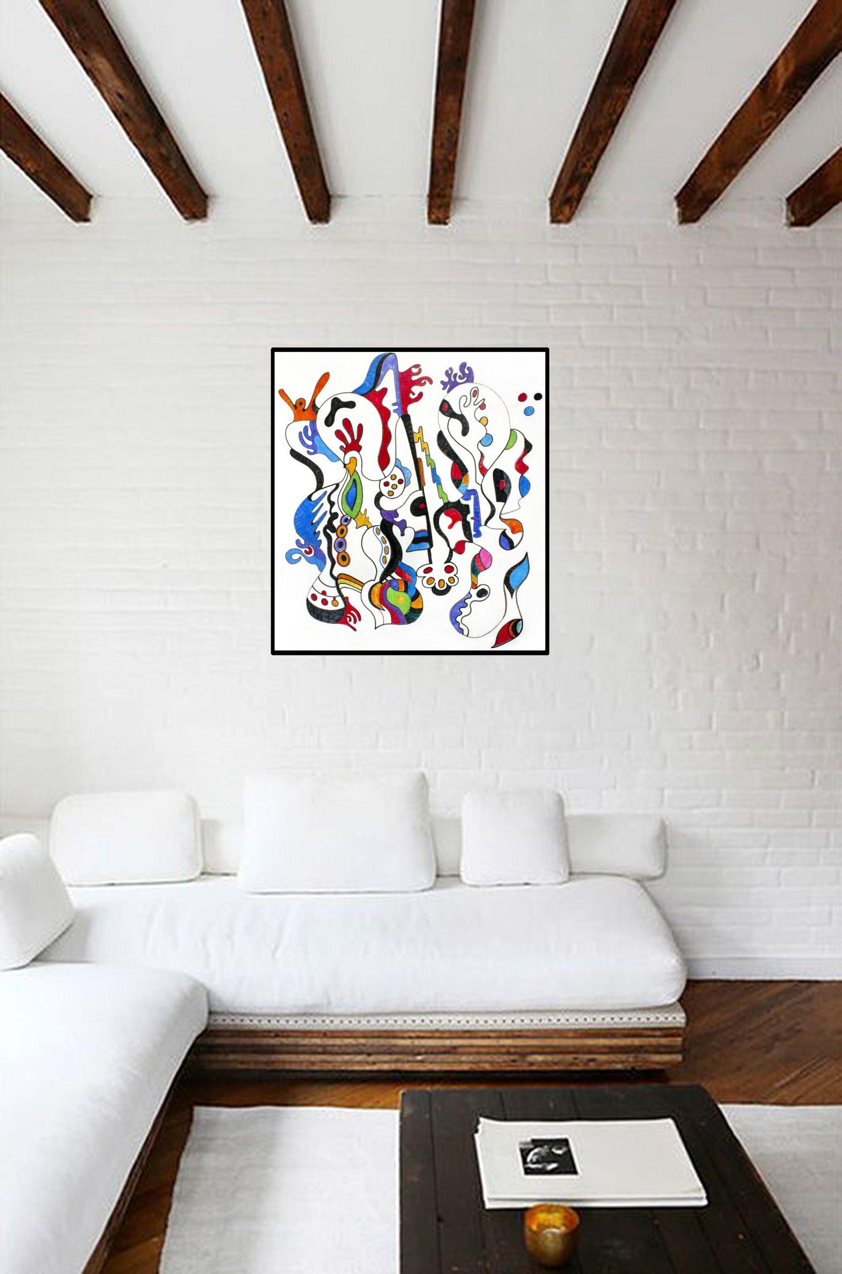 This work is created through fluid, automatic line drawing, where two elongated, intertwined forms emerge in rhythmic dialogue. Influenced by Surrealist automatism and Miró’s biomorphic language, the composition balances symmetry and movement. Hand-drawn contours are filled with vivid, carefully placed colors that guide the eye across the figures, evoking dance, connection, and a playful exchange between structure and spontaneity. Work is not stretched and will ship in a tube.