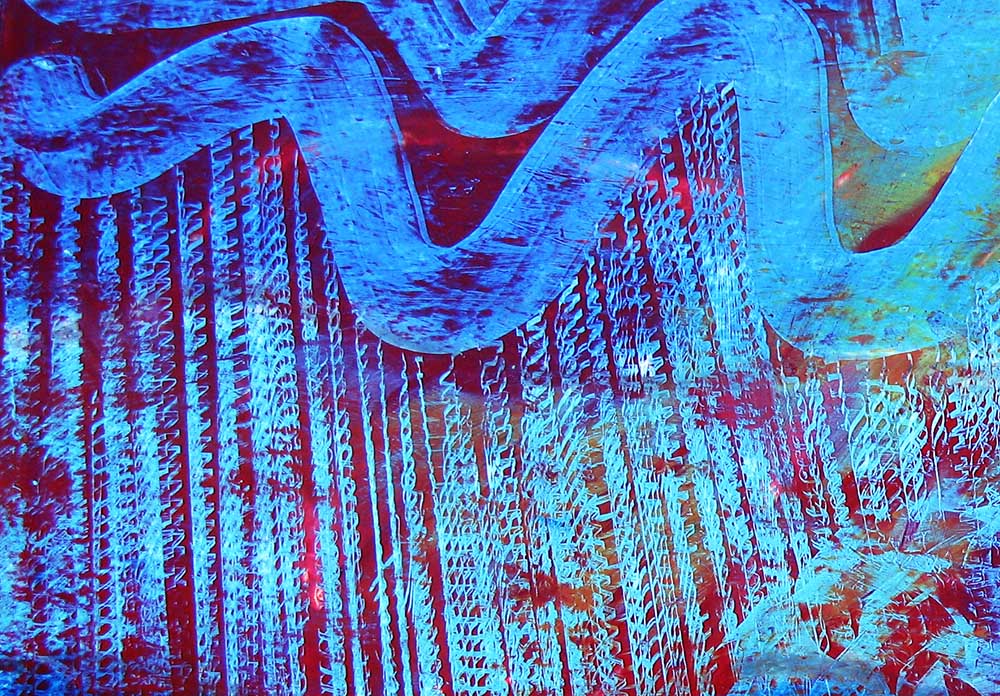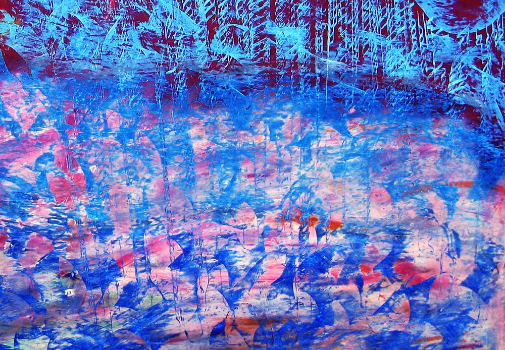 Dominating the surface is a rippling wave motif, executed in a blend of electric blues and aquamarine, creating a sense of movement and fluidity. The upper section features bold, sweeping strokes, evoking waterfalls or rushing rivers, while the lower section contrasts with a mosaic, layered patterns in soft pinks and purples, lending depth and complexity. The juxtaposition of cool and warm tones fosters a harmonious yet striking visual experience, evoking emotions of serenity and intrigue.