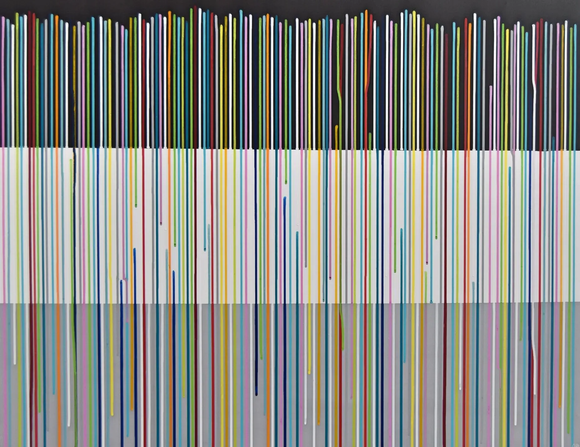 This work merges passion and structure into a harmonious composition. Using acrylic and spray paint, an abstract geometric landscape is created, inspired by minimalism and pop art. Vibrant stripes contrast with the monochrome background, enhancing energy and interest. The painting invites reflection on the beauty of pure forms and colors.