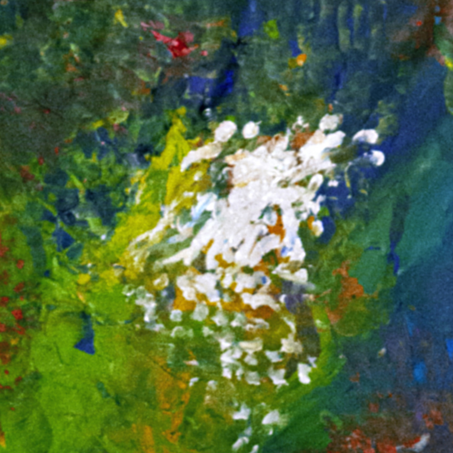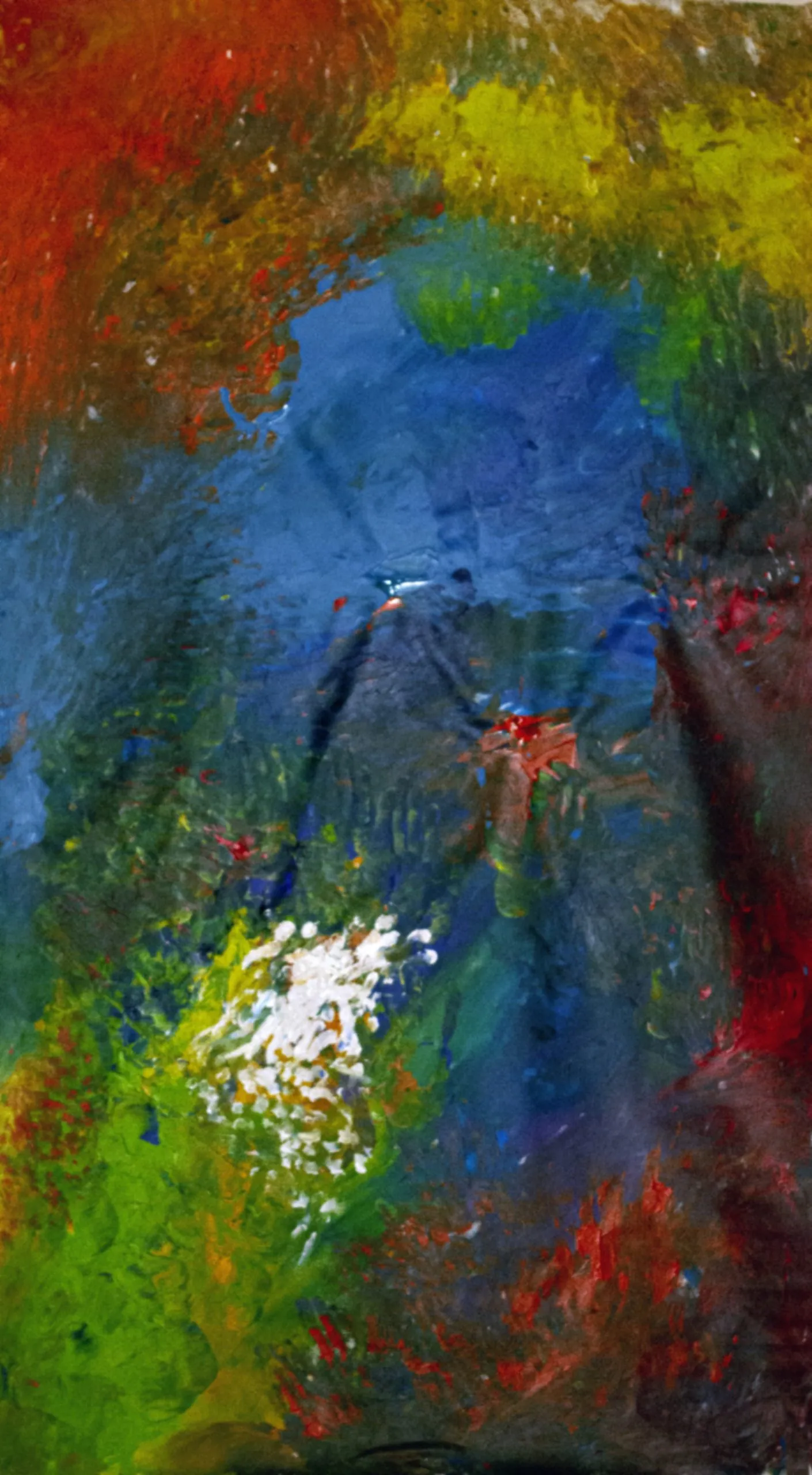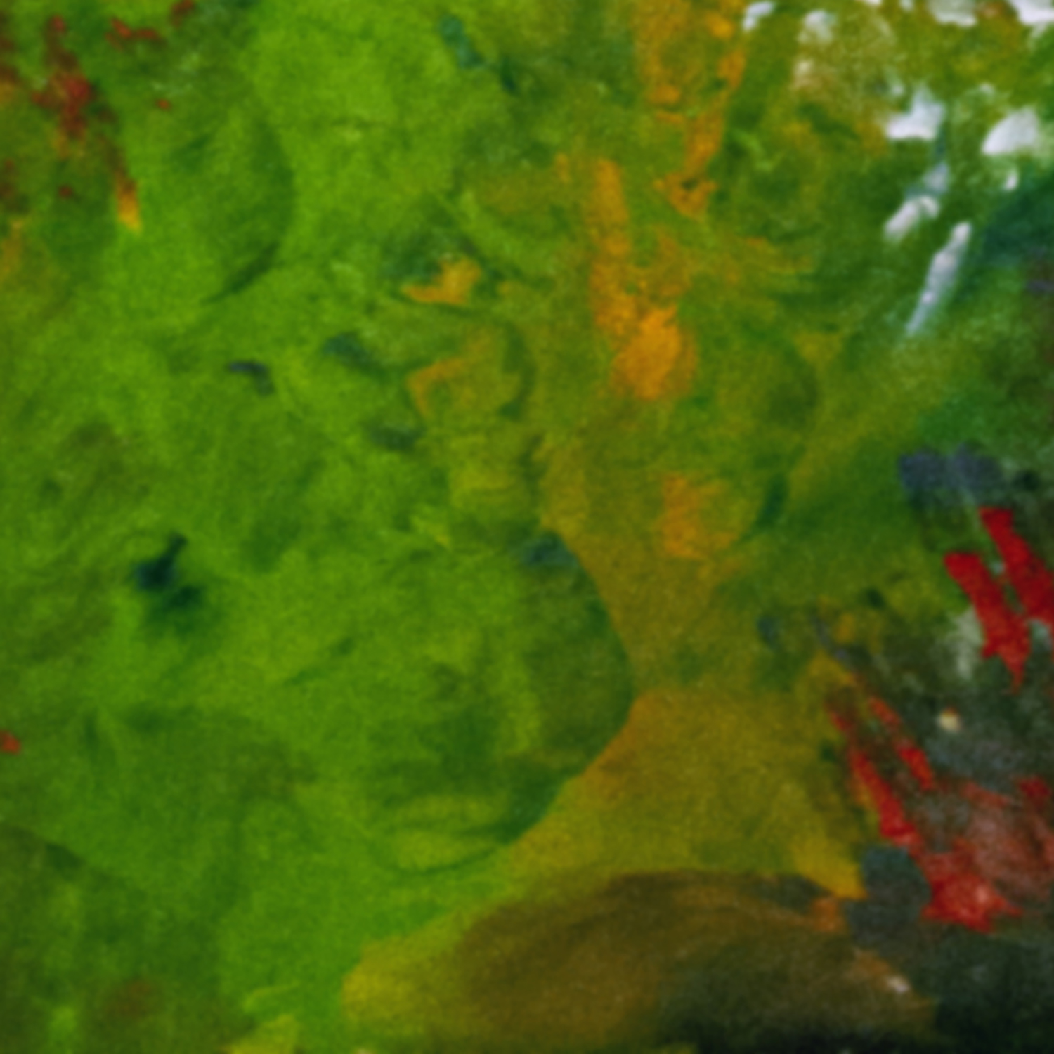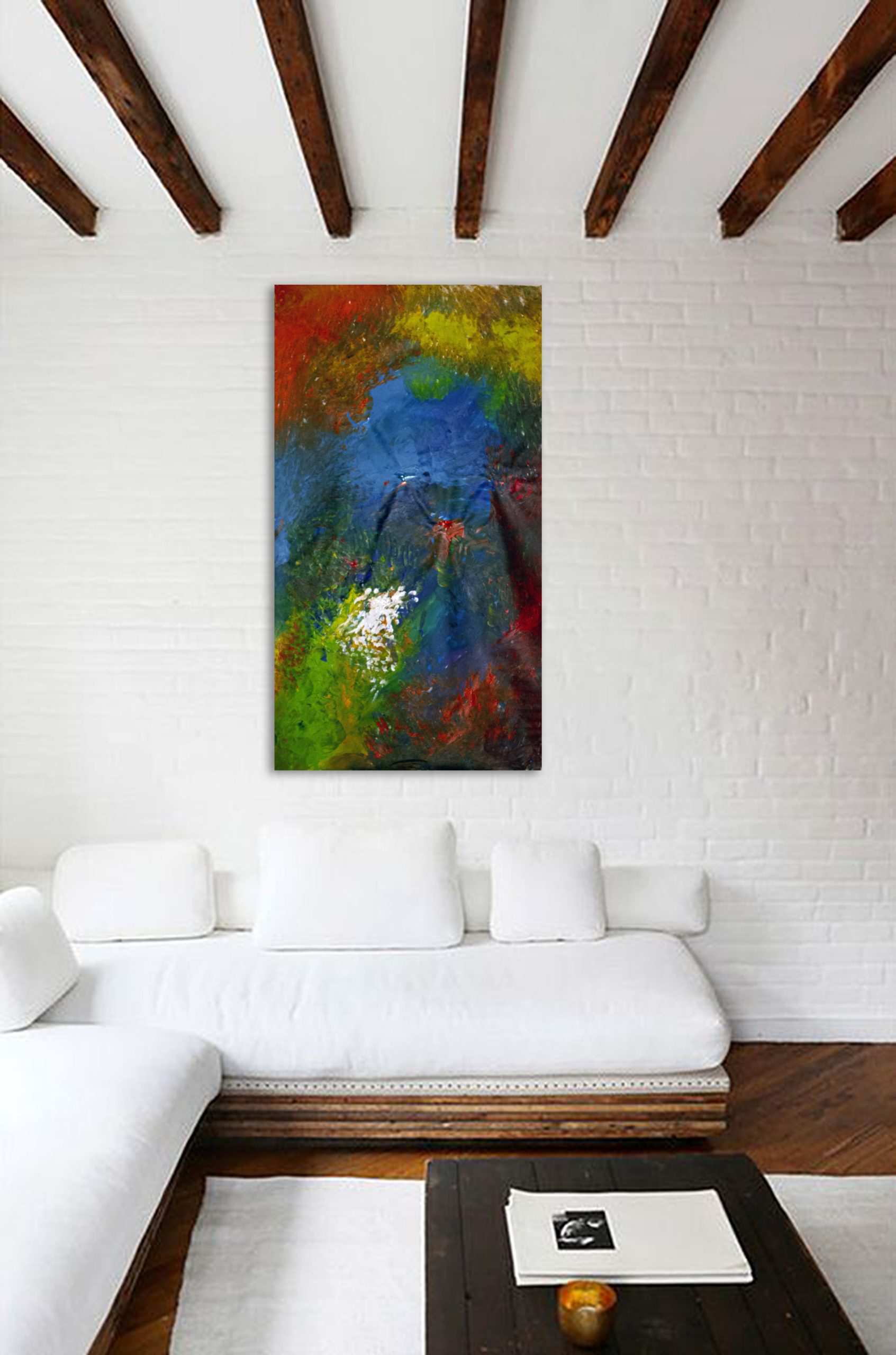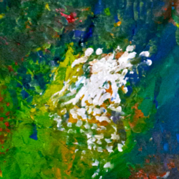 This painting develops through an intuitive layering of color applied with fingers and textured tools, allowing forms to surface organically. Deep blues create a central gravitational field, while surrounding reds, greens, and yellows vibrate in contrast. A luminous white cluster emerges as a point of resonance, suggesting breath, energy, or sound made visible. Influenced by music and inner sensation, the composition favors movement over structure. Ships in a tube.