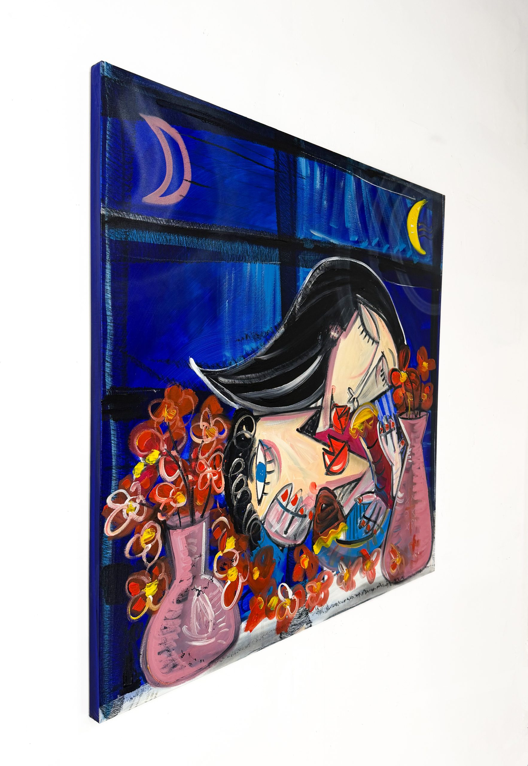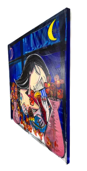 This work, Siviglia’s personal reinterpretation of a Marc Chagall painting, captures the intimacy and delicacy of an embrace through cubist forms and vibrant colors. The warm energy of the flowers enters into dialogue with the deep blue of the night, amplifying the poetry and magic of the moment.