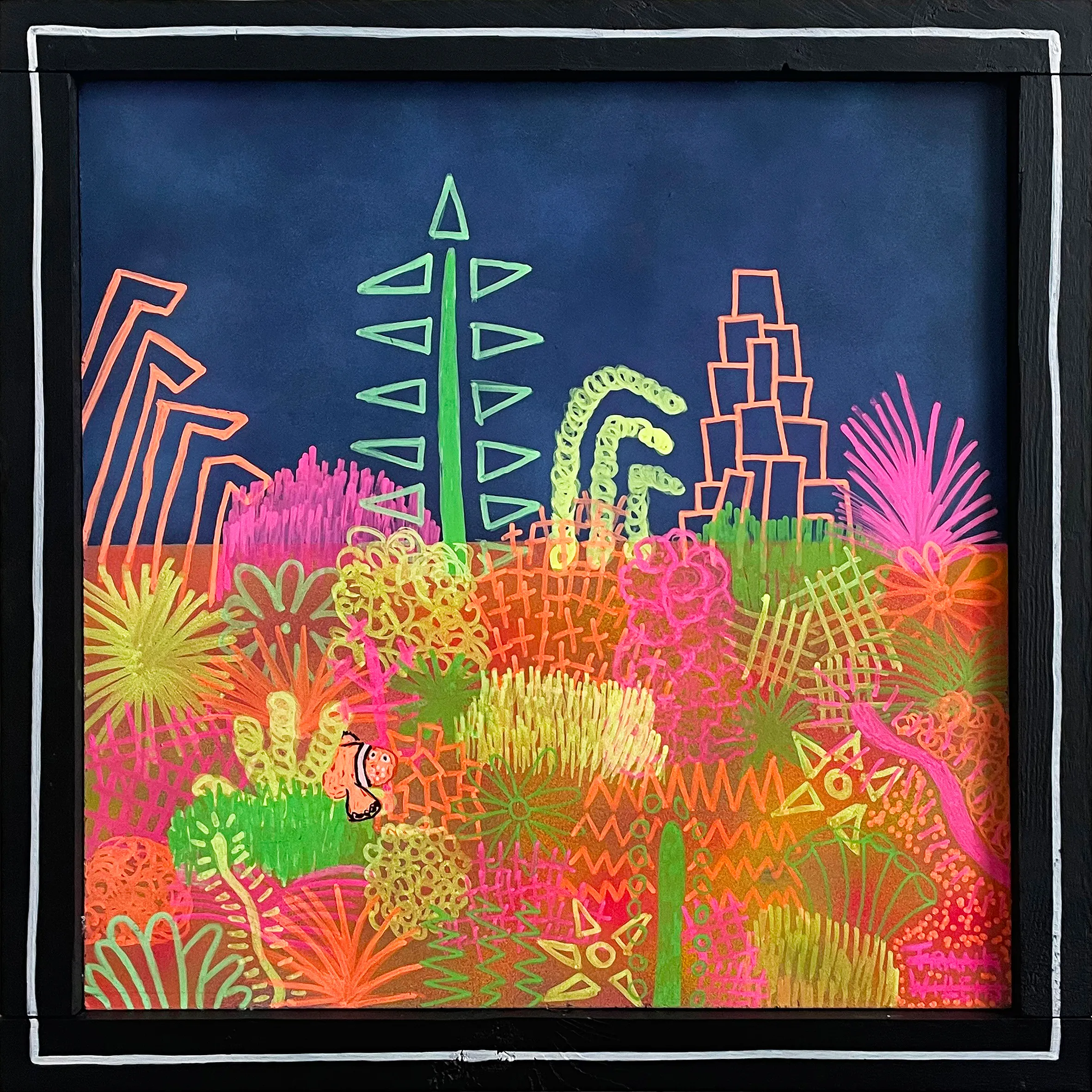 Discarded materials, especially reclaimed wood, form the foundation of his work. Not only for sustainability reasons but also for their raw, lived-in appearance, which adds depth to his compositions. He embraces the imperfections of the material and incorporates them into his expressive visual language, where cartoonish figures, skeletal forms, and animals frequently appear. His work is playful and colorful, yet beneath the cheerful exterior often lies a deeper, sometimes confrontational layer.