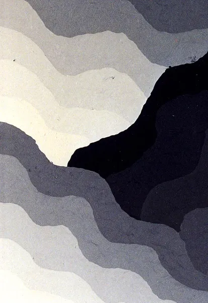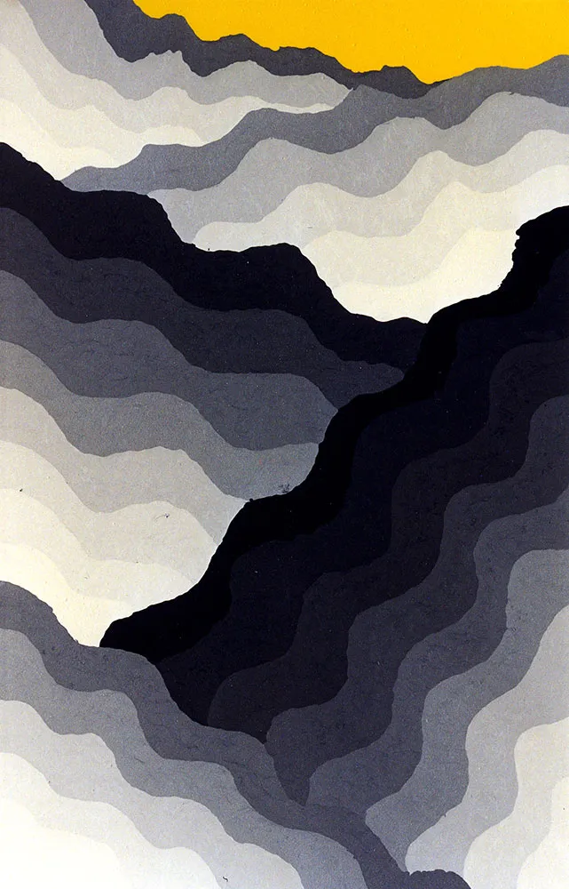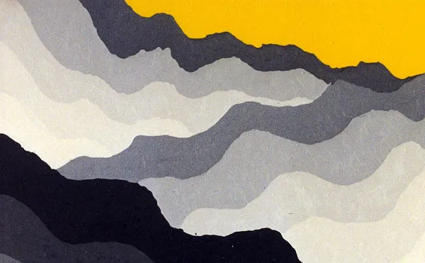 A composition of various undulating layers, each distinguished by its distinct shades of silver. In stark contrast, a vivid yellow weaves its way across the top, bringing an unexpected vibrancy that revitalizes the piece. The use of color and form transforms this piece into an exploration of depth and perception, accurately.
