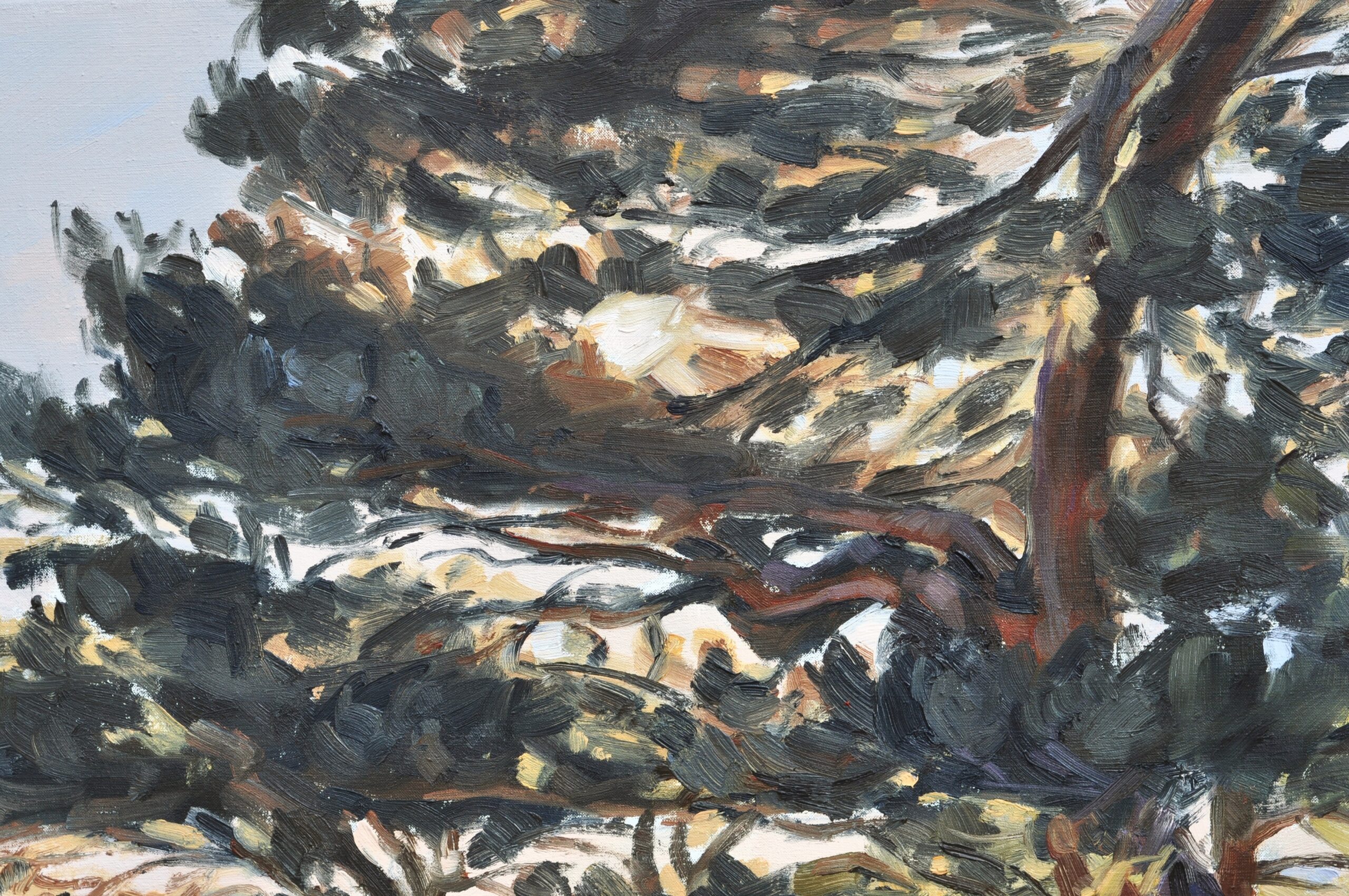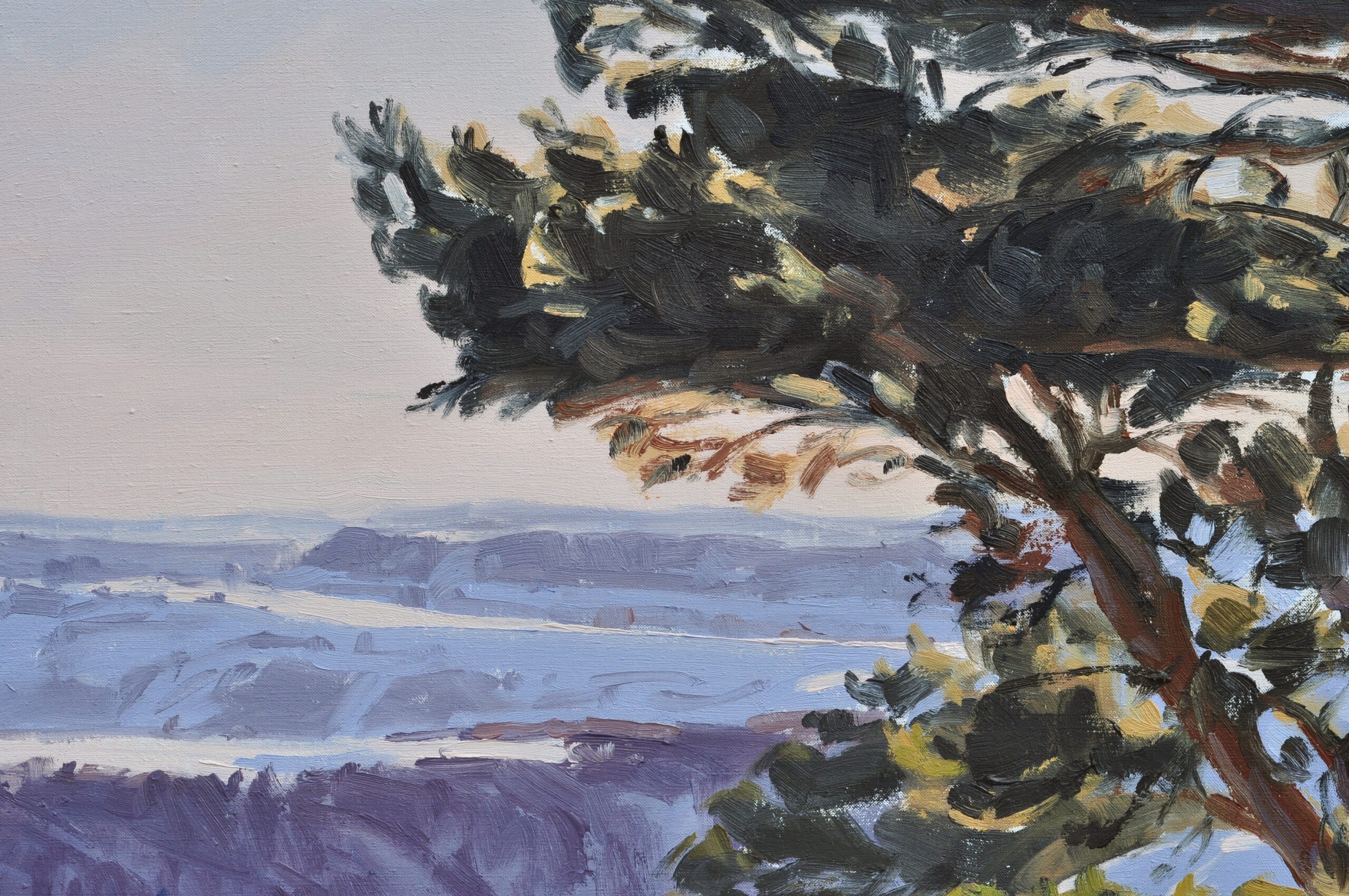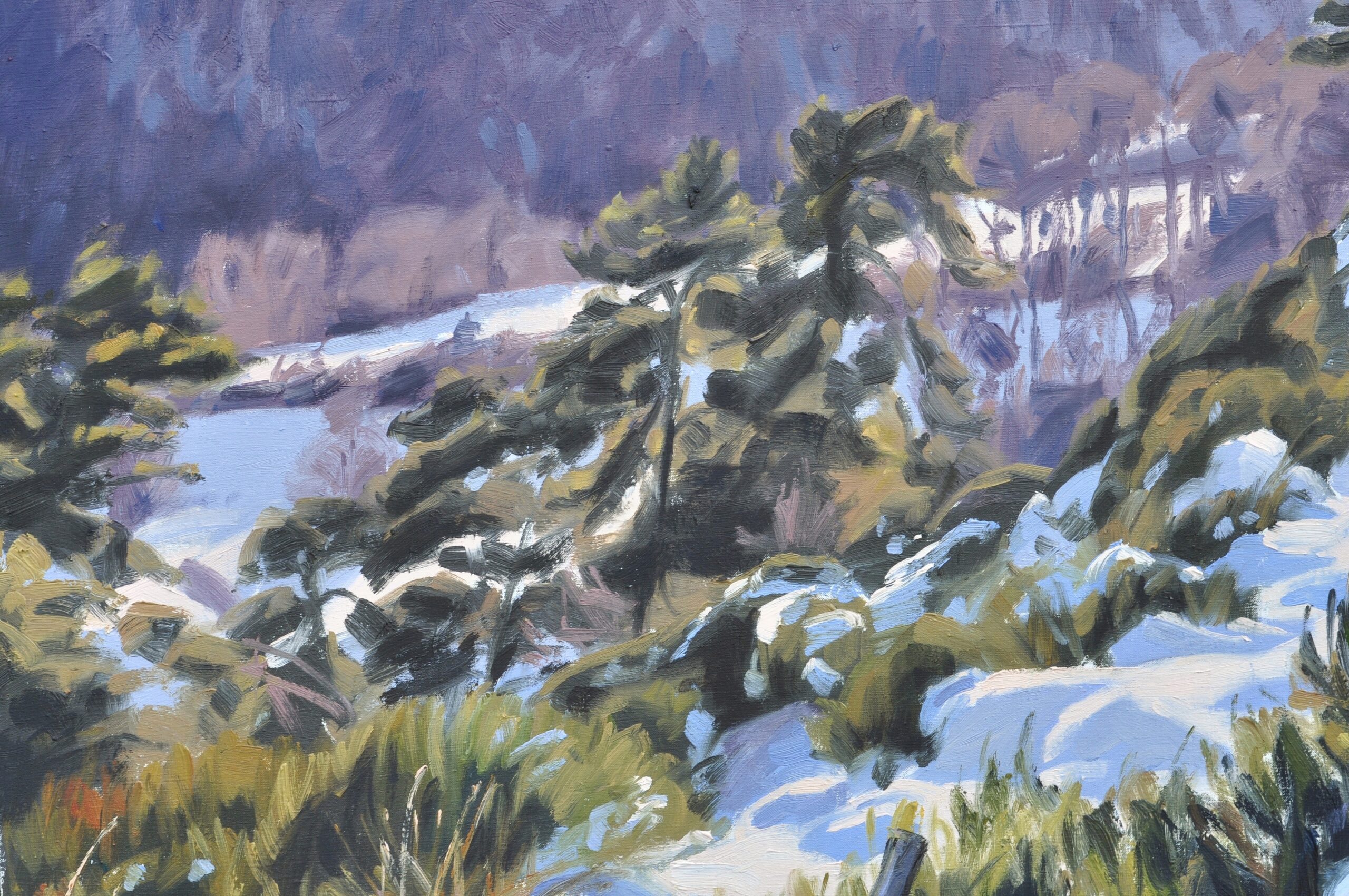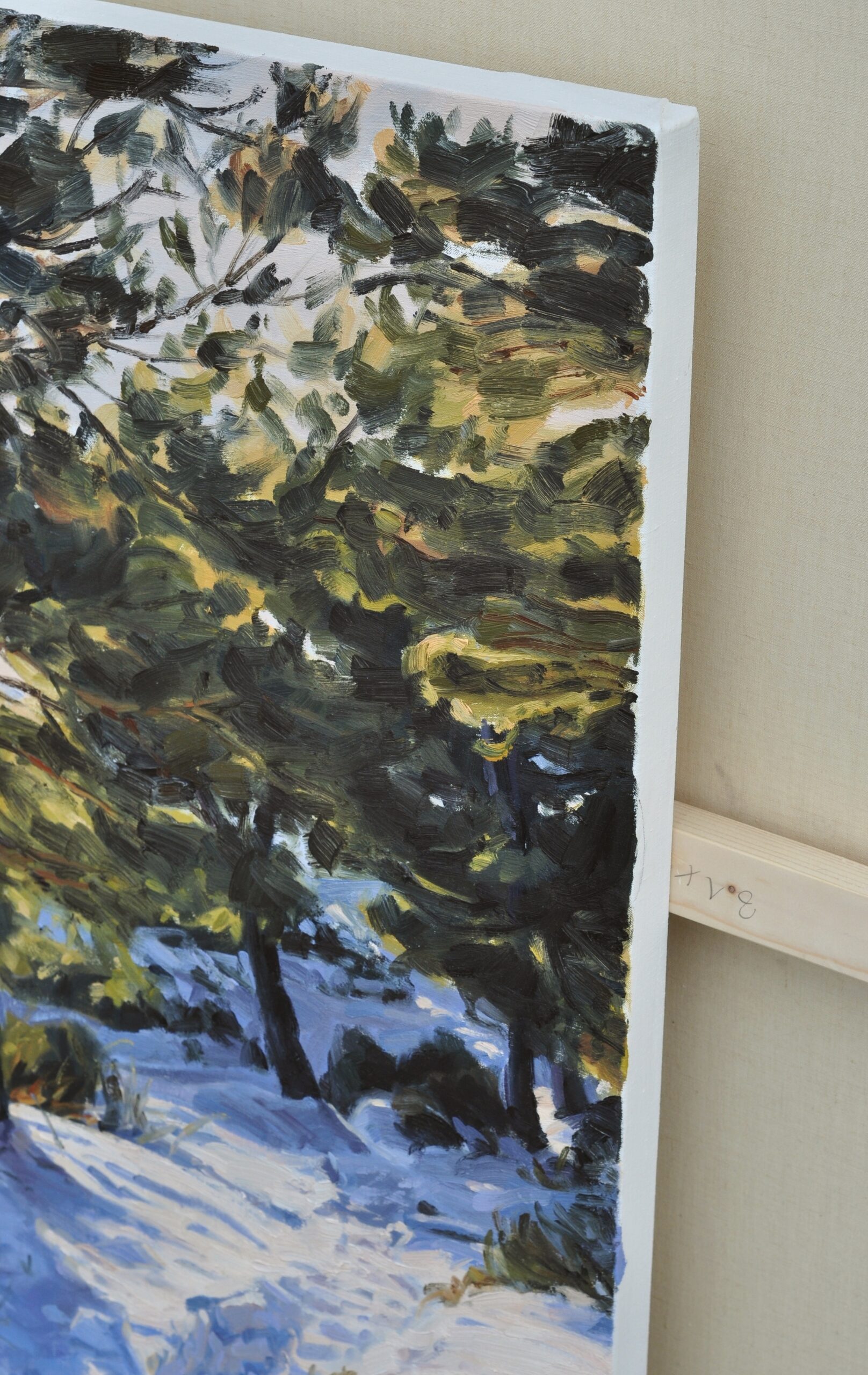 This cornice path, overlooking a deep valley, offers an exceptional view of the Mezenc massif. It winds its way between the deep-rooted pine trees, which seem to salute the immensity of the landscape. In this canvas, I've tried to capture the last rays of the sun, still warming this winter landscape for a few moments.