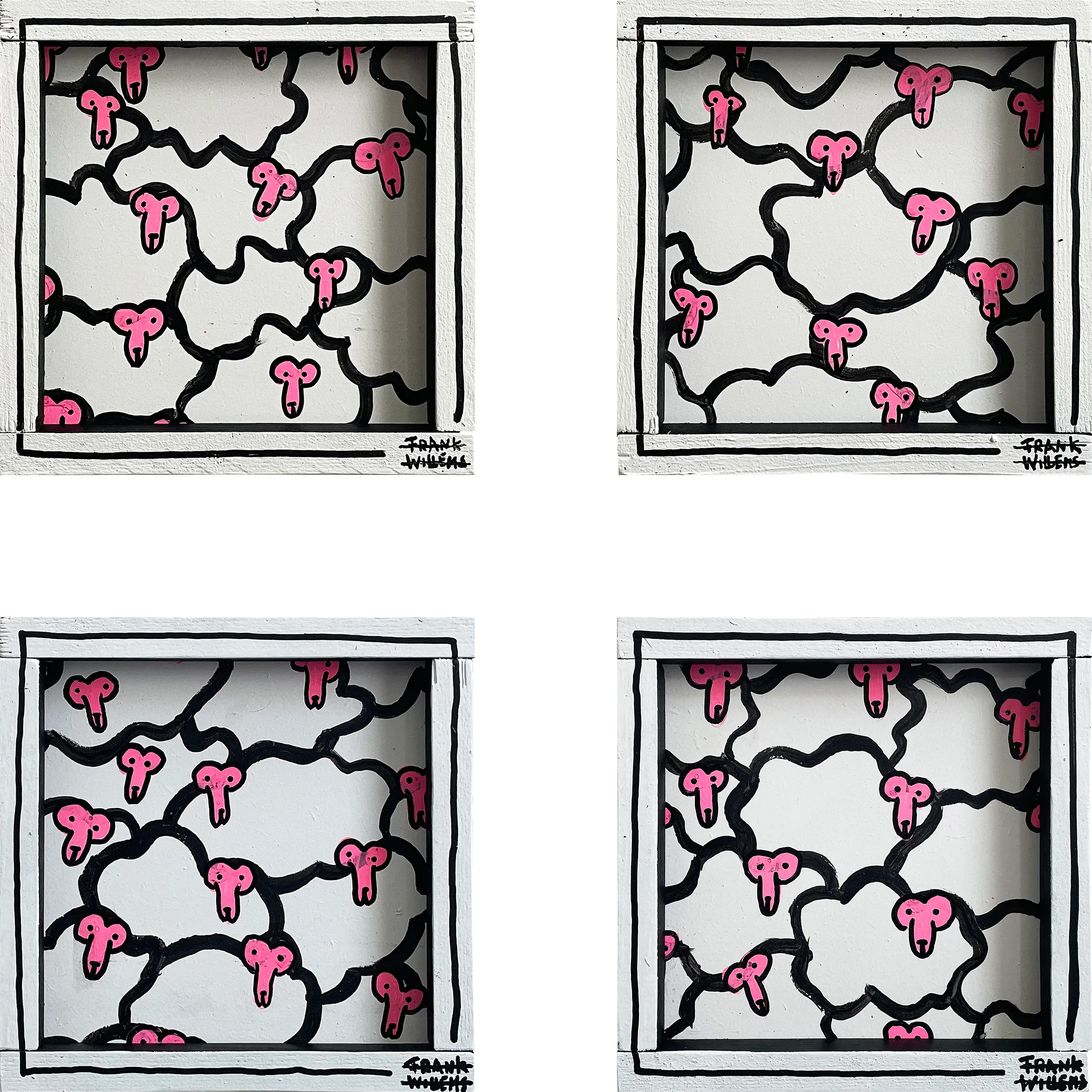 Frank Willems creates art that is constantly evolving. His style is an eclectic mix of urban art, pop art, and neo-expressionism, in which he plays with visual language and text as an image. His work moves between humor and seriousness, chaos and structure, reality and absurdity. Willems works intuitively and spontaneously, driven by an unstoppable work ethic and a desire to break free from conventions. Discarded materials, especially reclaimed wood, form the foundation of his work. Not only for sustainability reasons but also for their raw, lived-in appearance, which adds depth to his compositions. He embraces the imperfections of the material and incorporates them into his expressive visual language, where cartoonish figures, skeletal forms, and animals frequently appear. His work is playful and colorful, yet beneath the cheerful exterior often lies a deeper, sometimes confrontational layer. Nostalgia plays a significant role in his art. Willems draws inspiration from the spirit of the times, his fears, and memories of the past. He magnifies everyday subjects, distorts them, and transforms them into a visual language that feels both familiar and alienating. Text plays an essential visual role, with his consistent use of an inverted letter ‘e’ and crossed-out words. These elements are more than just stylistic choices; they spark curiosity, inviting the viewer to look further, search for hidden meanings, and question conventions in a playful manner. His work is bold, expressive, and confrontational—yet always infused with humor. He challenges the viewer with absurd contrasts, satire, and self-mockery. Themes such as sex, consumer society, social dynamics, and the human psyche are presented in a playful yet sharp manner. He creates art that is not only visually striking but also carries a deeper meaning that reveals itself upon closer inspection. Frank Willems’ work has been exhibited in the Netherlands, Germany, and the United States and has been auctioned by Christie’s. He regularly participates in KunstRai Amsterdam and has completed a residency at Sofitel Legend The Grand. His work is owned by collectors worldwide and can be found in galleries, private homes, and even public spaces. Through his art, Willems seeks not only to tell stories but also to challenge, provoke, and push people out of their comfort zones. His works feel like organized chaos, where humor and depth come together.