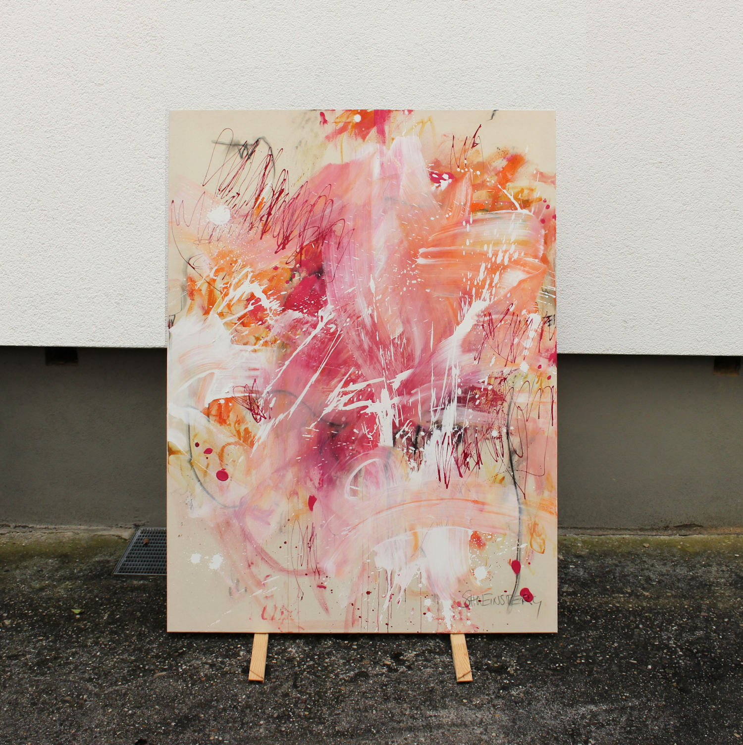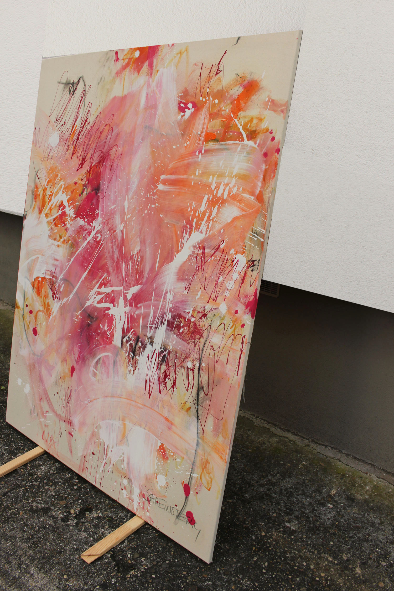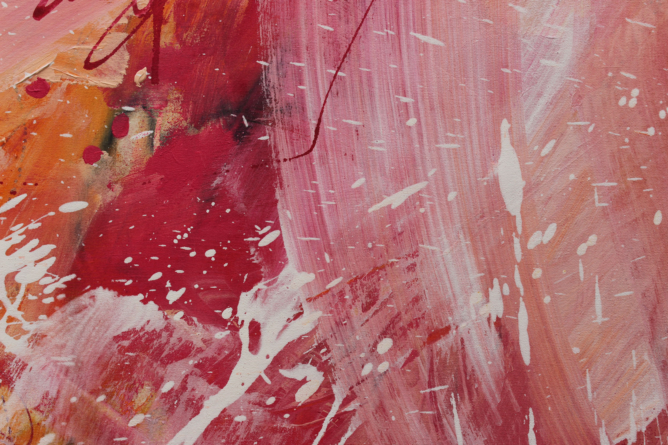 Extra large abstract painting by Daniela Schweinsberg. A spontaneous, expressive work where fine crimson scribbles evolve into bold gestures. Soft white fields meet yellow, orange, rosé, and deep red, creating a vivid visual dialogue. The contrast between dynamic chaos and the warm red‑rosé palette gives the piece a surprising sense of calm, making it a striking statement for modern spaces.