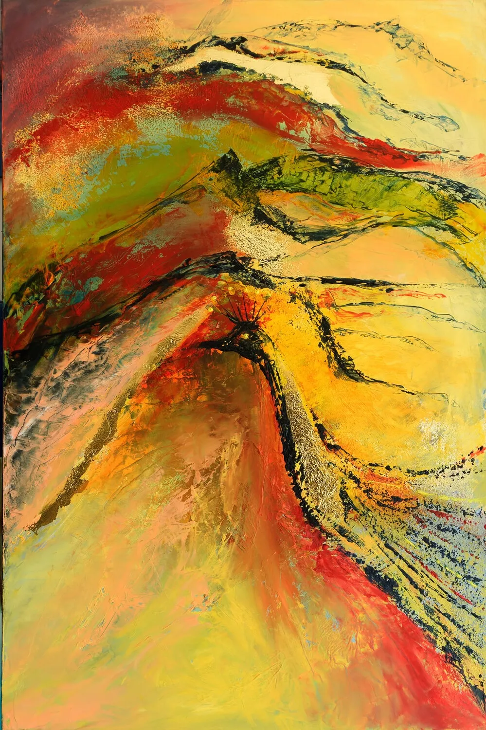 L'imagerie surgit dans un geste spontané en jouant avec les couleurs lumineuses et chaudes accompagnée de feuilles d'or, stimulant l'imagination et l'émotion