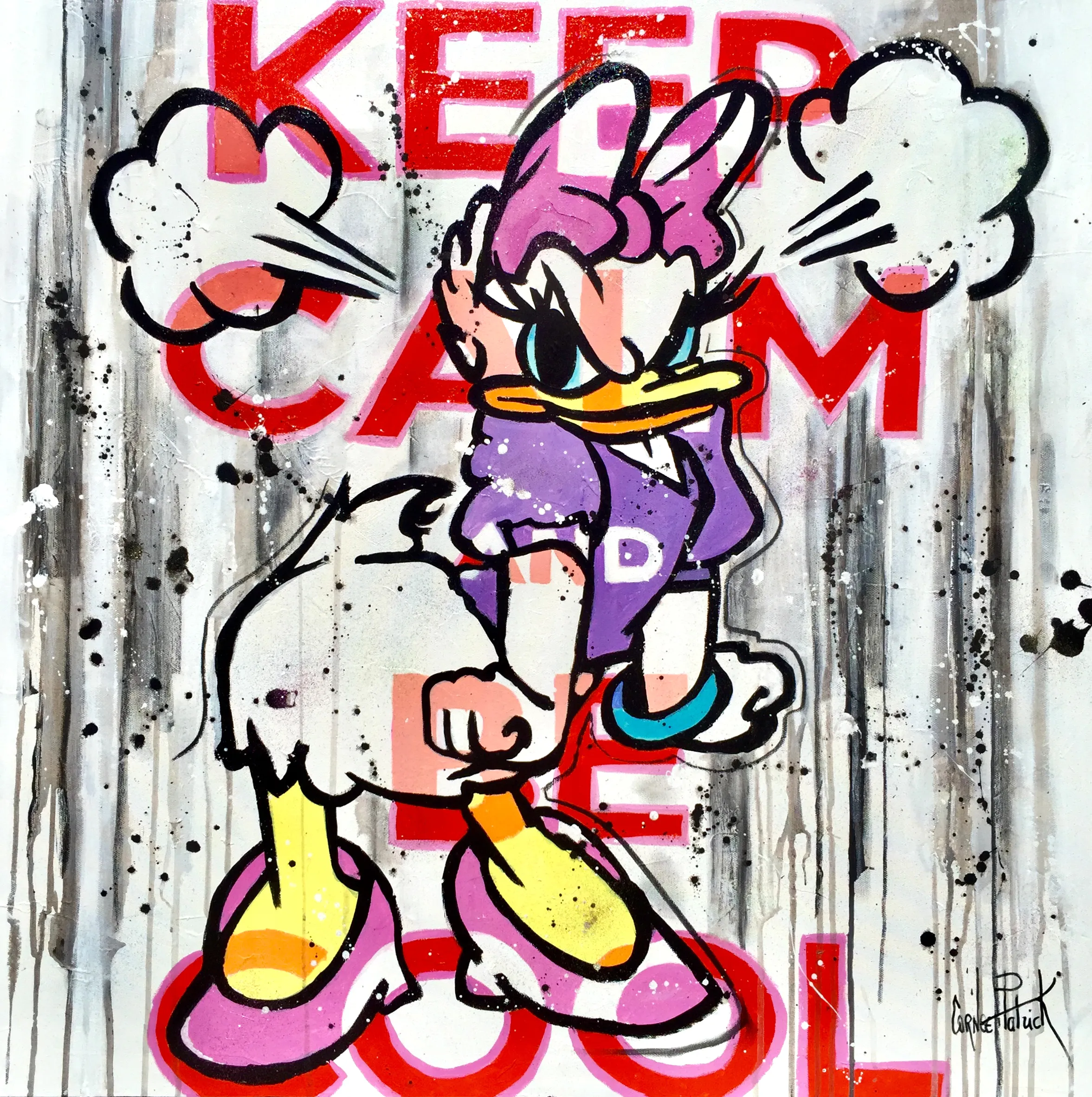 A pop art and street art take on angry Daisy Duck, Daisy Duck is a fictional character from the duck universe created by Disney studios, her nickname is super Daisy. Unique and original work signed by the painter Patrick Cornée, delivered with invoice and certificate of authenticity. The canvas is varnished for better protection of the work and is ready to be hung on the wall.