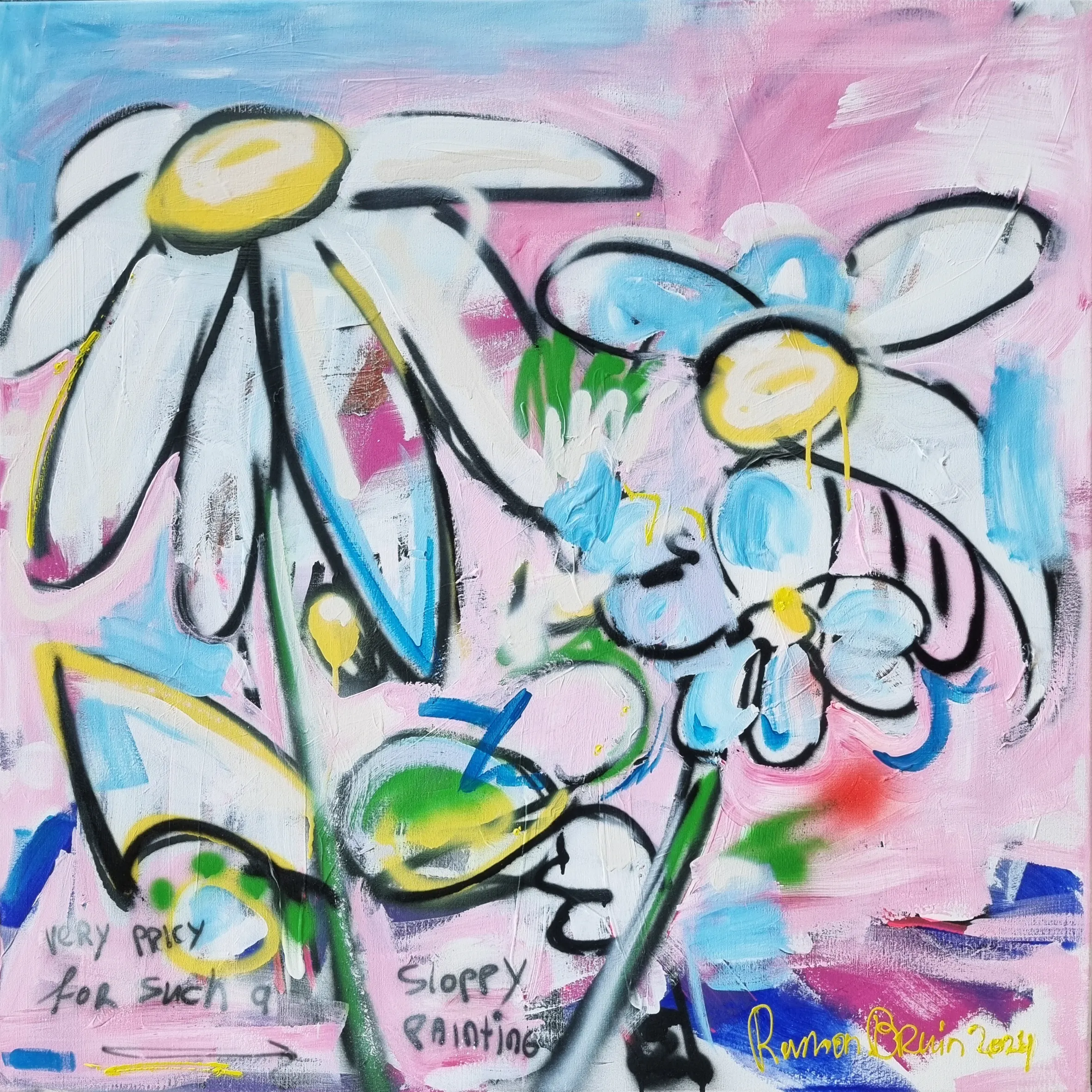 In crafting this piece, I've unleashed a whirl of emotions onto the canvas. Bold strokes and an invigorating palette reflect an unrestrained joy. The juxtaposition of acrylics with the raw textures of spray paints manifests a dance of mediums. There's an undercurrent of playfulness that echoes the vibrancy of life itself. Embrace this artwork's vivacious energy, which promises to inject a breath of exuberance into any space.