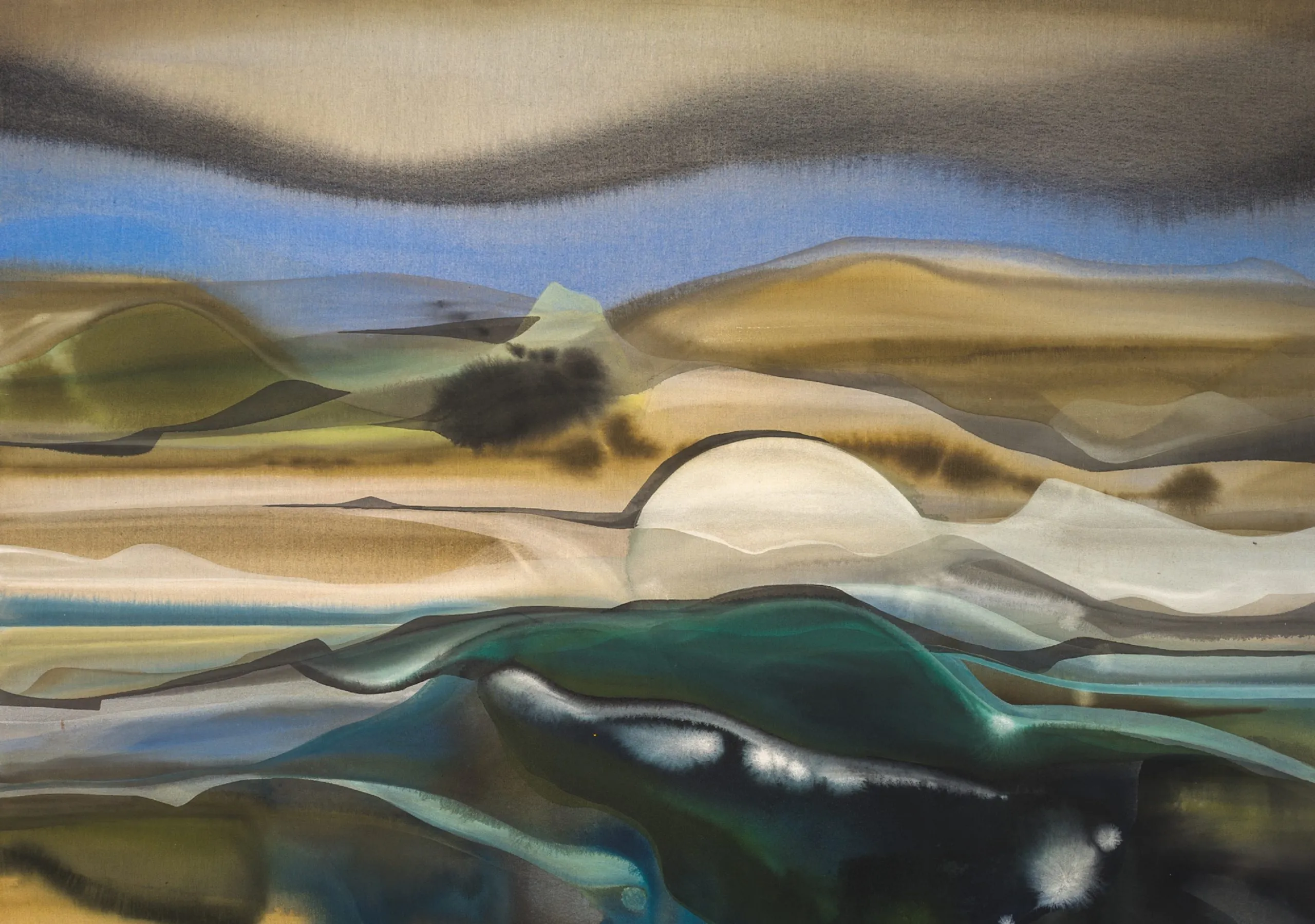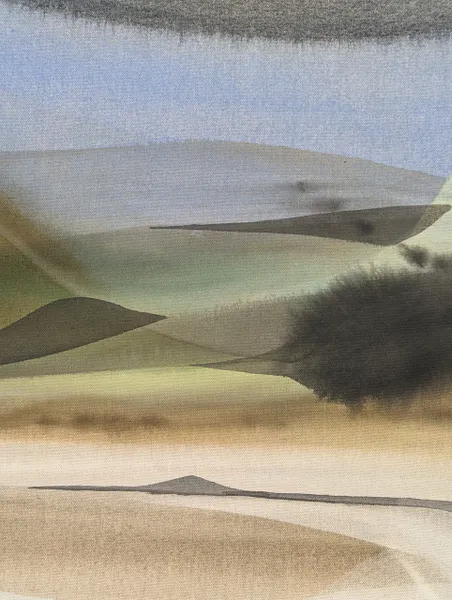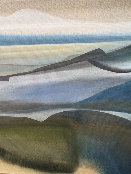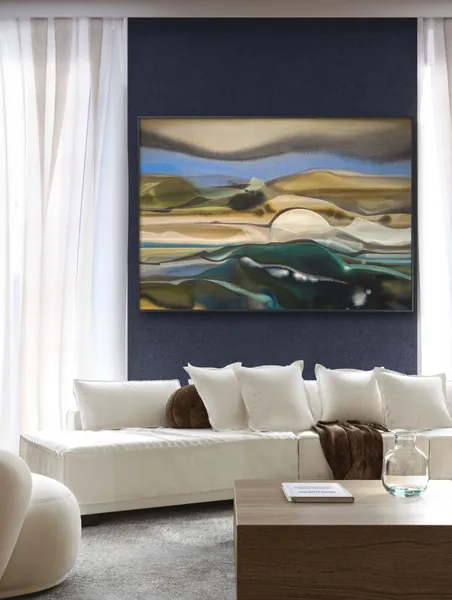 This artwork presents a mesmerizing landscape where fluidity and abstraction converge. The composition’s flowing lines and undulating forms evoke a serene yet dynamic terrain. A harmonious palette of earthy browns, verdant greens, and soft blues sweeps across the canvas, suggesting rolling hills and a vast sky. The central focus is a luminous arc, possibly a sun or moon, emerging from layered horizons, casting gentle reflections on a tranquil body of water. The scene is enveloped in a dreamlike