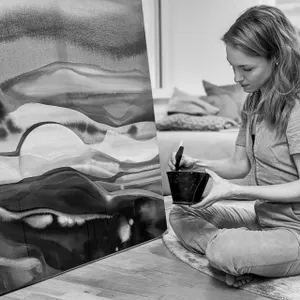 Her work is characterized by a search for unique effects, combining flowing color gradients, sharp contrasts, and color gradations—often accompanied by a vibrant dose of chance that breathes life into her pieces. As a physician, she has always had a predilection for the extraordinary and for people, and has therefore worked as a doctor in Germany's largest prison and in acute psychiatric care. Her works are a reference to the unconscious processing of every human being. She dilutes acrylic paints with water and applies them in numerous transparent layers. This technique creates overlays and depths of color that take the viewer on a visual journey between reality and abstraction. Her style is an homage to classical landscape painters, while simultaneously incorporating strong abstract elements to bridge the gap to modern art. Her work combines organic, natural impulses with experimental techniques, so that each painting represents a unique symbiosis of control and chance.