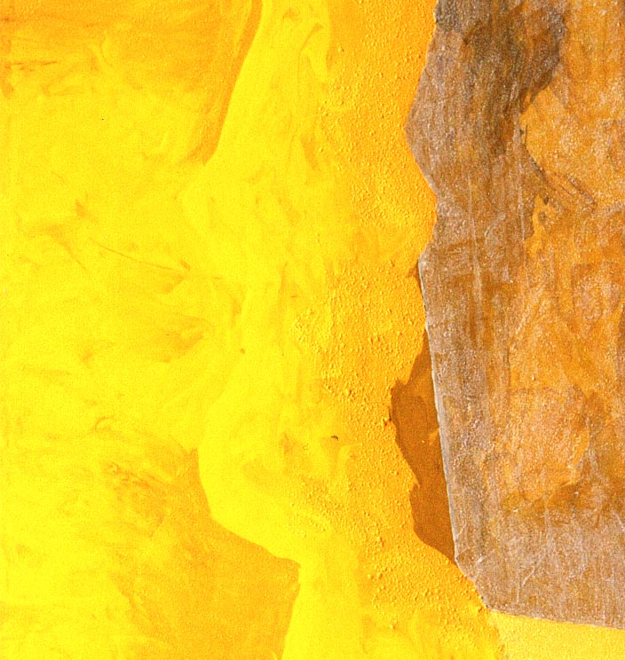 The juxtaposition of yellows and coppers conveys a sense of energy and depth. The dominant yellow shapes, resembling cascading flames or molten lava, create dynamic movement across the canvas. In the center, a textured vertical form, in muted earth tones, anchors the piece, suggesting a sturdy, pillar-like structure. This central element adds a grounding effect amidst the energetic surroundings, emphasizing the interplay between stability and chaos. The work subtly balances contrast and harmony.