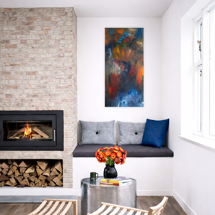 This abstract piece evokes elemental transformation through bold, layered brushwork. Painted with acrylics using palette knives and brushes, it captures the eruption of light through darkness. Influenced by nature’s raw forces and emotional alchemy, the composition blends chaos and stillness in a deeply atmospheric rhythm.