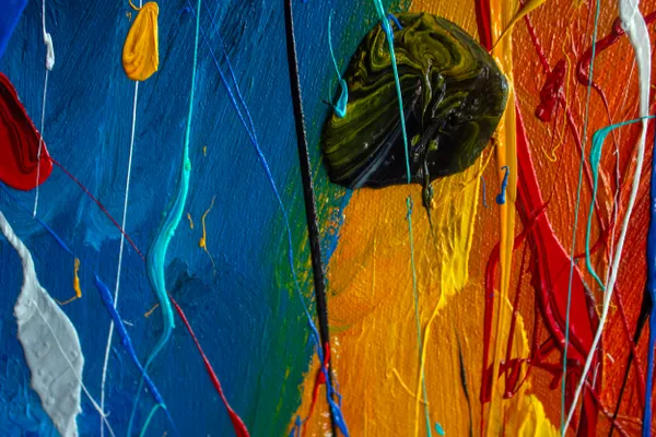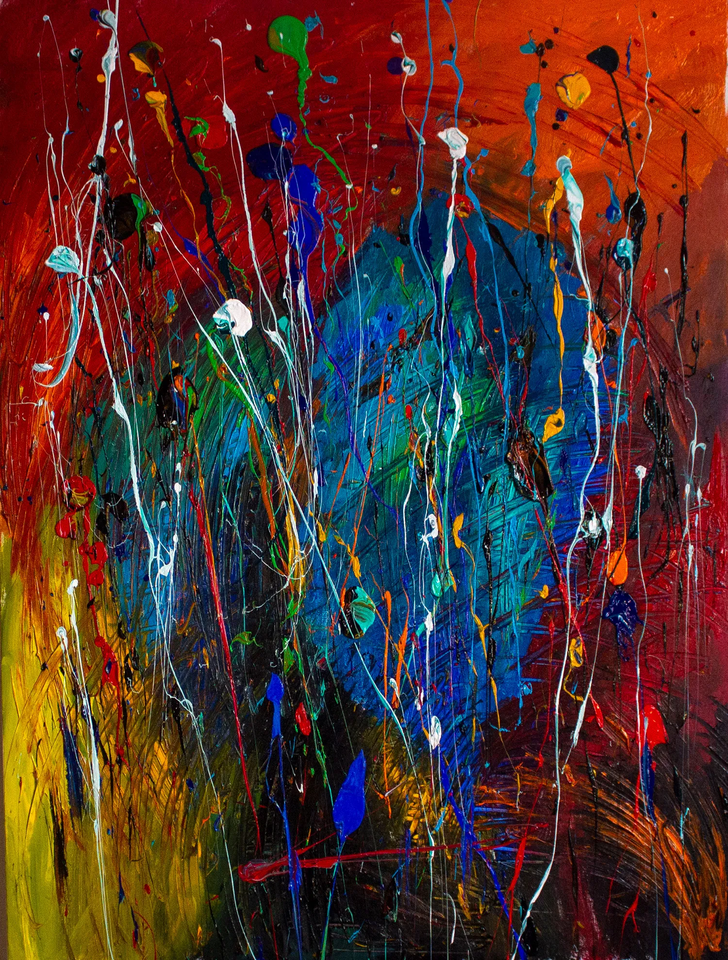This painting is created through an instinctive, physical process combining layered acrylics, sweeping gestures, and vertical paint drips. Dense color fields are crossed by spontaneous splashes and gravity-driven lines. Influenced by Abstract Expressionism—particularly the action painting of Jackson Pollock and the chromatic intensity of Gerhard Richter—this work evokes a luminous, atmospheric space where emotion, movement, and transformation unfold through color and texture.