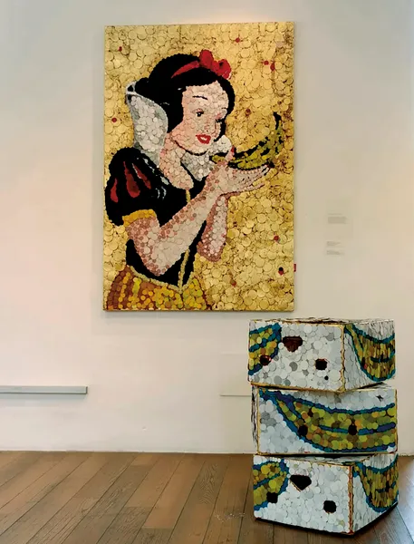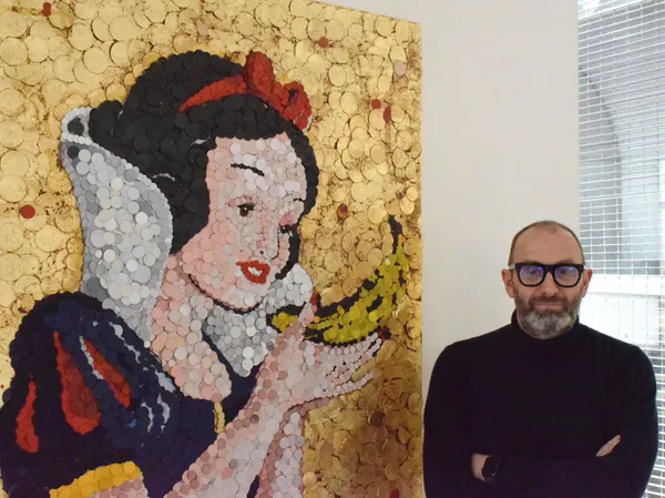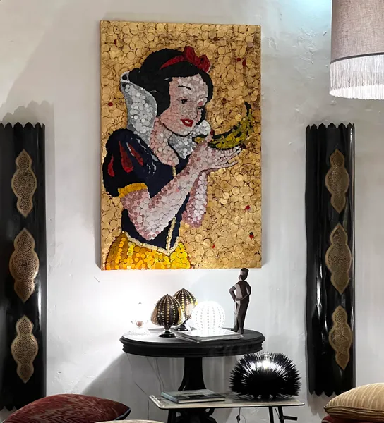 In questo lavoro la Biancaneve di Walt Disney tiene in mano la banana dell'iconica copertina realizzata da Andy Warhol per i Velvet Underground per una doppia citazione all'arte e alla musica. Ho fuso l'acrilico, l'olio, il collage e la foglia d'oro per creare una rappresentazione audace e moderna di un'iconica figura pop.