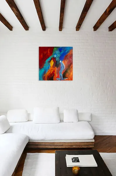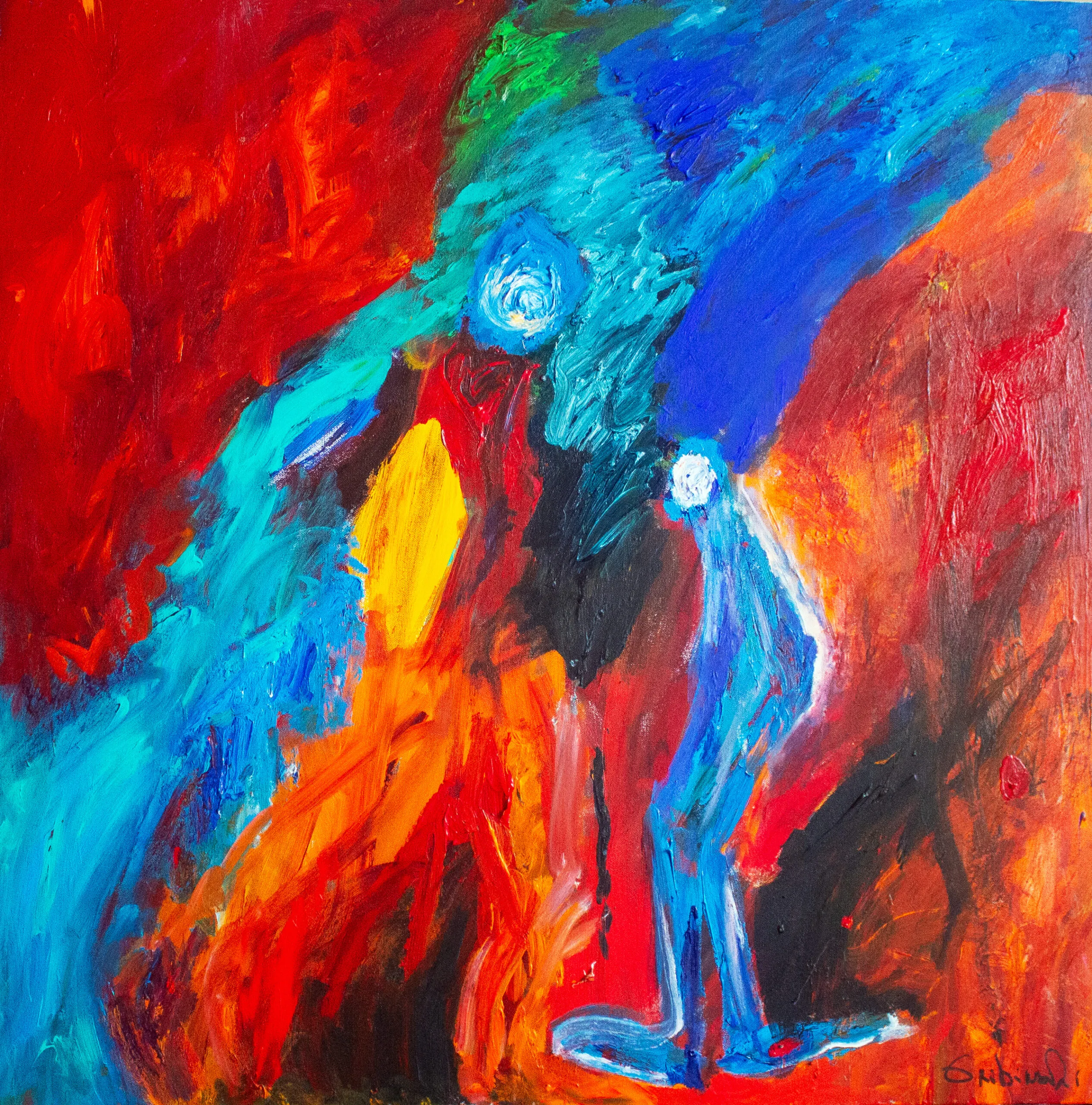 Father and Son captures an intimate emotional exchange through bold, gestural strokes and a fiery color palette. With fluid lines and layered hues, the figures emerge from abstraction—connected yet distinct. This piece reflects Nathalie Gribinski’s fascination with energy, movement, and the invisible threads that tie generations together.
