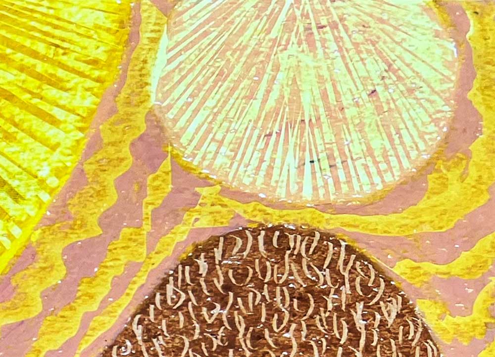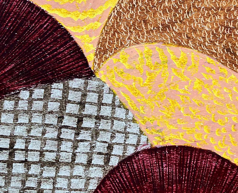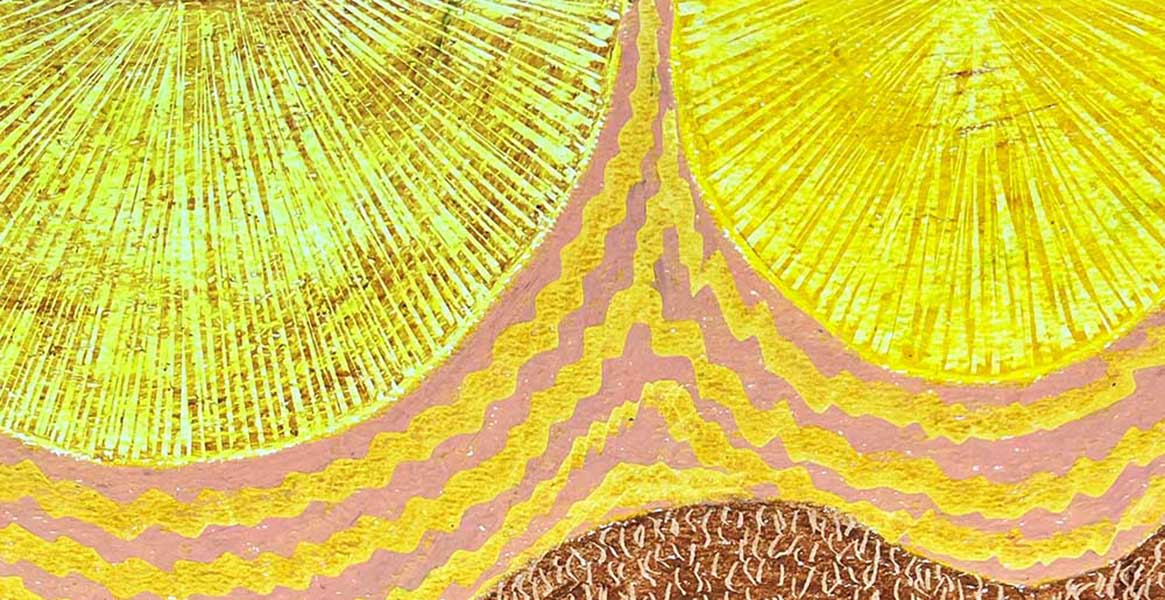 This vibrant abstract landscape is dominated at the top by radiant yellow circles overlapping like blazing suns, their brilliance intensified by concentric striations. Below, a series of undulating waves in earth tones, deep browns, and soft ochres evoke a sense of movement and openness. The burgundy crescents, with their fan-like strokes, suggest shadows or hills, grounding the composition with their dark elegance.