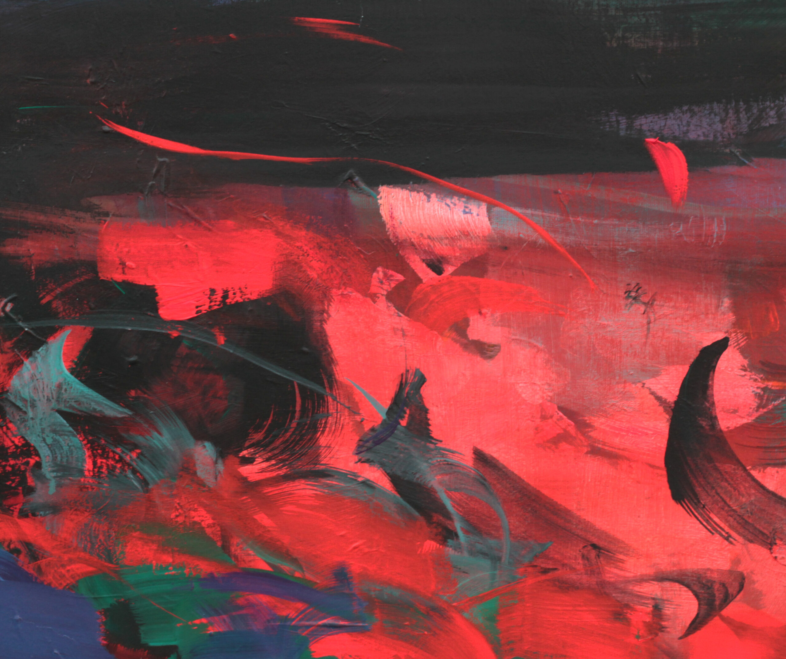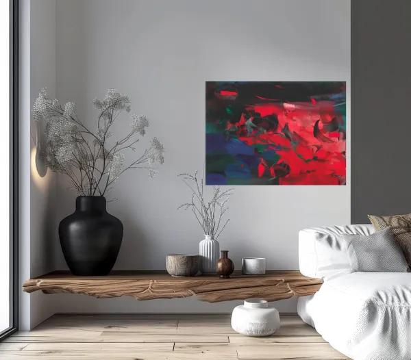"Firecracker" is a captivating abstract painting that captures the essence of red rising from the depths of darkness. The use of highly pigmented acrylics on canvas creates a visually striking composition. The sides are painted black, providing a clean, contemporary look, and the artwork is varnished with a matte finish, including UV protection. This medium-sized painting is ready to hang, offering immediate enjoyment without the need for framing. It will be shipped in a crate.