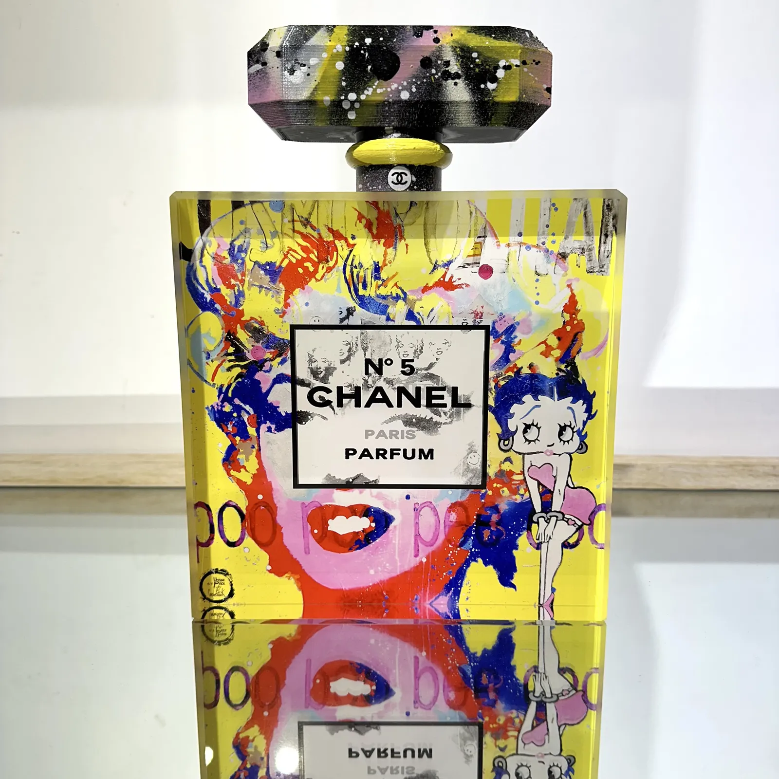 In this work 'Flacon Chanel n°5, Marilyn et Betty, jaune' I explored the intersection between iconic luxury and vibrant pop culture. Using acrylic, resin and Plexiglas, I created a sculpture that captures both timeless sophistication and bold energy. The assemblage blends the classic imagery of Chanel N°5 with colourful, cartoon-like graphic elements, symbolising a collision between tradition and modernity. This piece brings a touch of bold joy and contemporary spirit to any space.