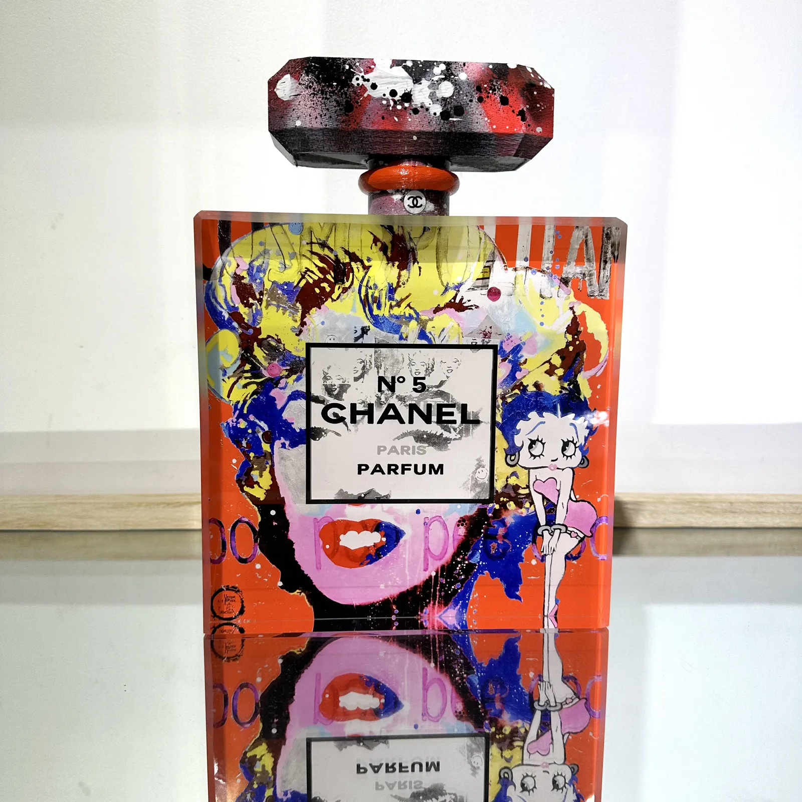 With this work, I celebrate the fusion of haute couture and pop art. Using acrylic, resin and Plexiglas, I have captured the vibrant and revolutionary essence of Chanel No. 5, enhanced by bold and colourful pop culture touches. This sculpture is an ode to boldness and innovation, designed to inject a spirit of youth and freshness into any modern space.