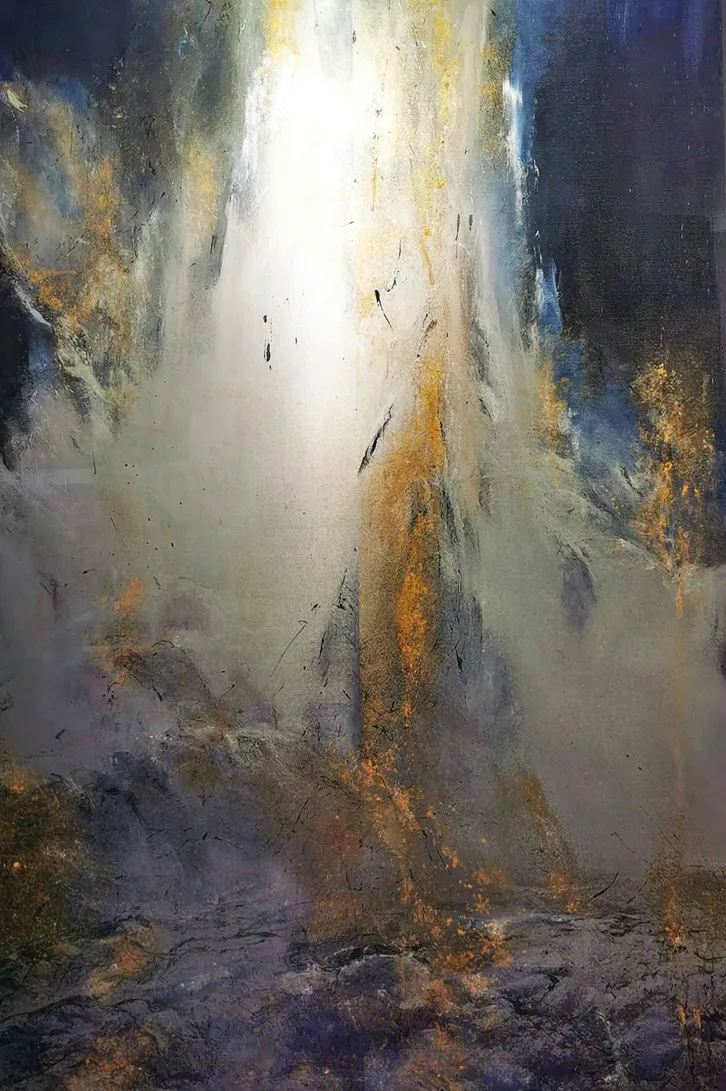 Murielle Argoud, an artist with French and Andalusian roots, comes from Lyon, where she began painting at a young age. Trained across Europe in the 1970s and 1980s—from France and Germany to Switzerland and Tuscany—she chose to step away from theory and draw her inspiration directly from nature. Her works blend oil and acrylic with materials such as lava, sand, gold leaf, and collage, creating powerful, textured compositions where natural forces—winds, snow, waterfalls, and glowing night skies—meet a vibrant, mystical light. Known for combining dramatic surfaces with a soft, poetic atmosphere, she has exhibited in over 50 solo shows and international art fairs, including New York and Venice. Her works are held in private and public collections, and even in a chapel in Geneva. Constantly seeking new horizons, she feels at home wherever art and inspiration meet.