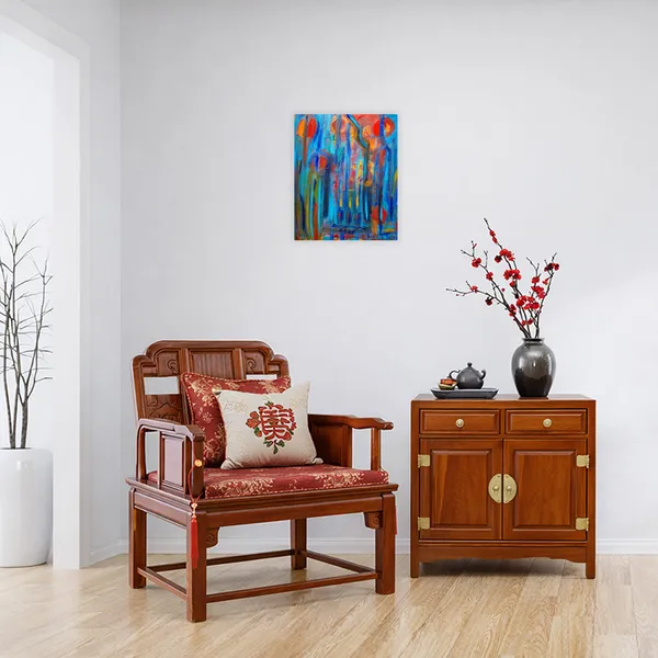 Painted on cardboard, this vibrant abstract evokes a world where suns rise and fade into memory. Thick textures and fluid brushstrokes in blue, red, and gold create a layered, emotional atmosphere. “Forgotten Suns” captures the tension between radiance and disappearance—an echo of light that lingers in the soul.