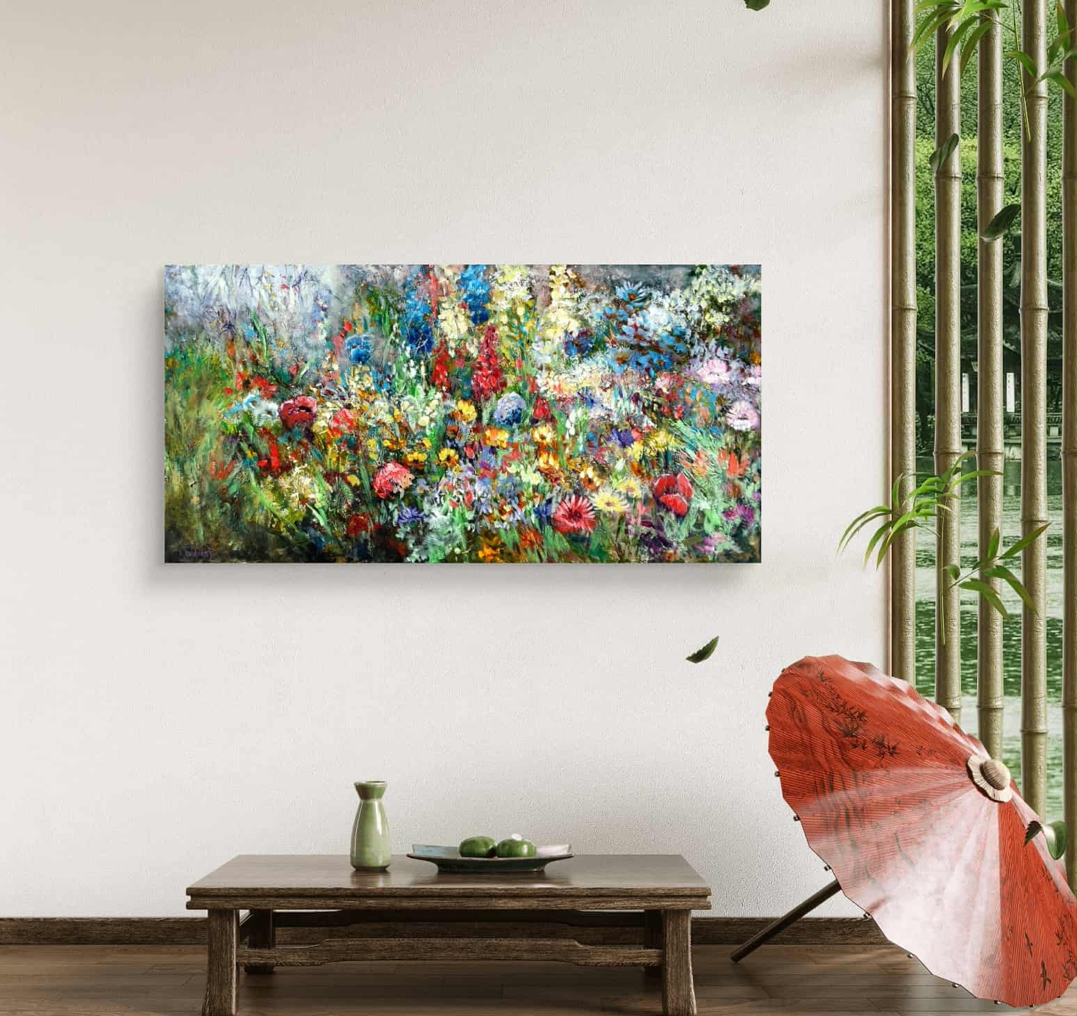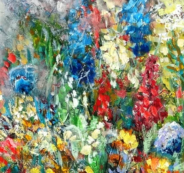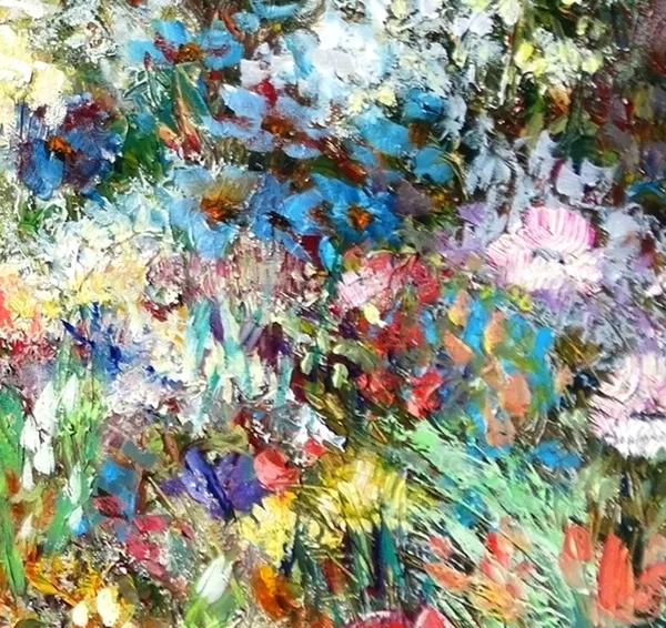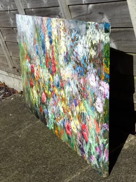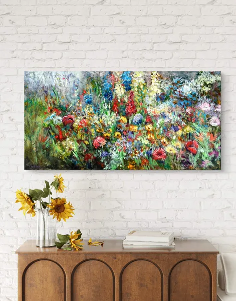 This piece is full of colour, movement and layered textures — I worked with oils to build depth and bring the feeling of standing right there among the blooms. Instead of focusing on individual flowers, I aimed for the overall atmosphere: sun-touched petals, the rustle of stems, and the energy of a meadow at its peak.